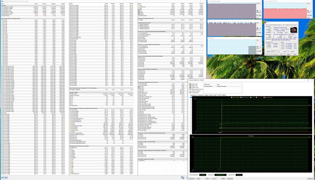AMD Precision Boost 2.0 позволил частотам по ядрам подняться до 4,0 ГГц, однако выше уже не получается, термозащита срабатывает: нагрев процессора достигал почти 100 °C, поэтому временами частоты сбрасывались. При этом СО работала на пределе возможностей. Да, к сожалению, даже усиление обычной «водянки все-в-одном» не дало нужного результата: очевидно, что требуется особая ЖСО, рассчитанная именно на Threadripper 3xxx. В прошлом материале я использовал ЖСО Enermax Liqtech TR4 240, рассчитанную на TDP 500 Вт, и это дало свой эффект. Сейчас же явный упор в перегрев CPU. Понятно, что тесты от AIDA — чрезмерные, и в реальной жизни вряд будет такая разовая мощная нагрузка на процессор (даже Premiere так не нагружает, чтобы 100% по всем ядрам беспрерывно). Однако такие тесты показательны. Кстати, вот остальные параметры работы материнской платы были в норме: нагрев СО VRM не превышал 56 °C (на верхнем радиаторе вентиляторы лишь изредка запускались), чипсет TRX40 также не нагревался выше 55 градусов, так как его вентилятор на более чем 3000 оборотах в минуту прекрасно делал свою работу. К сожалению HWInfo64 дает неверные показания потребляемой мощности процессора: Threadripper 3970X в таком режиме потребляет более 350 Вт, а не на 70 меньше. Кстати очевидно, что СО VRM способна отводить более 300 Вт, что опять же идет в плюс материнке.