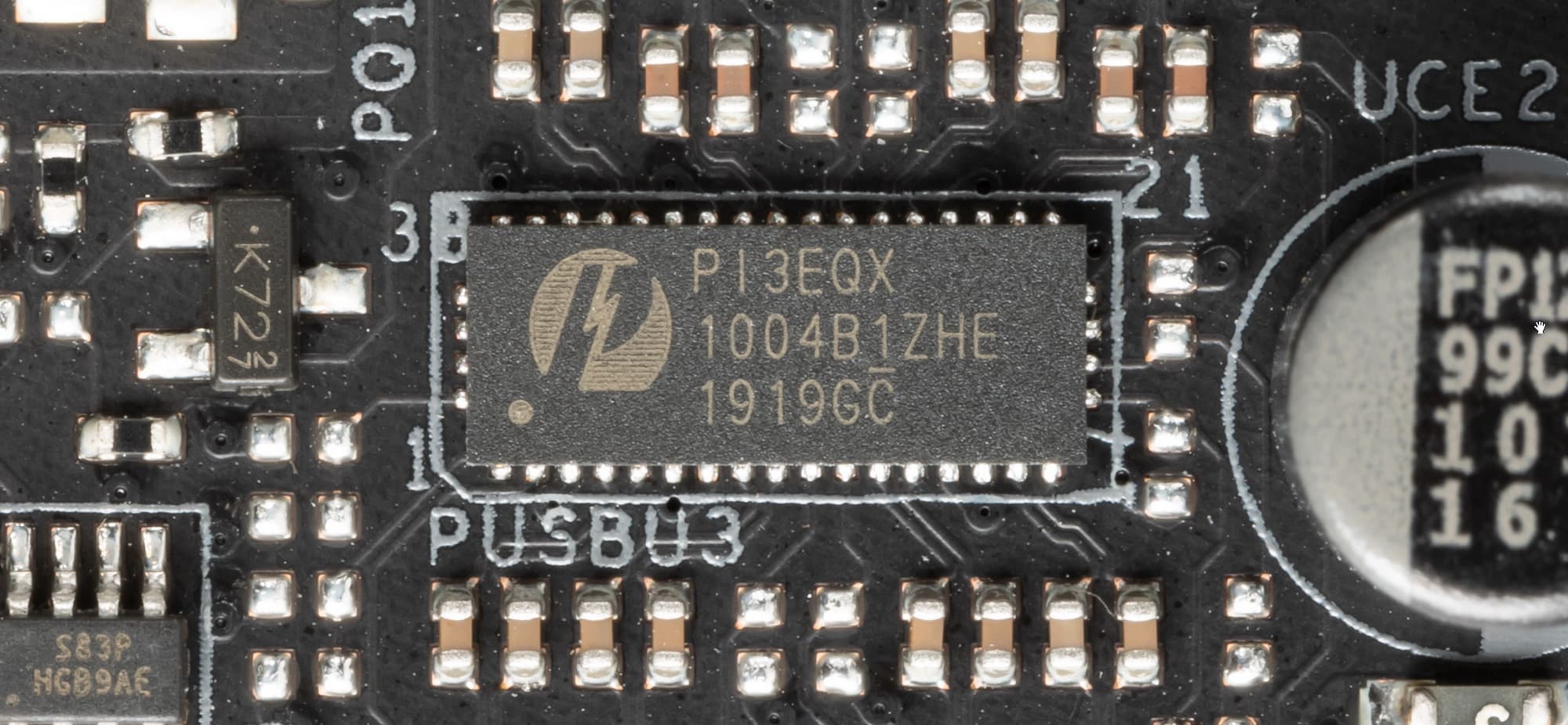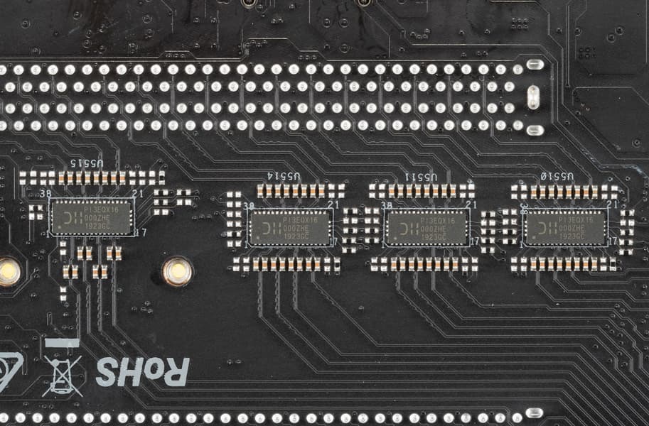 А также шину поддерживают многочисленные ре-драйверы (усилители сигнала), поддерживающие необходимый вольтаж для всей PCI-e периферии.