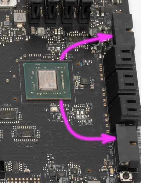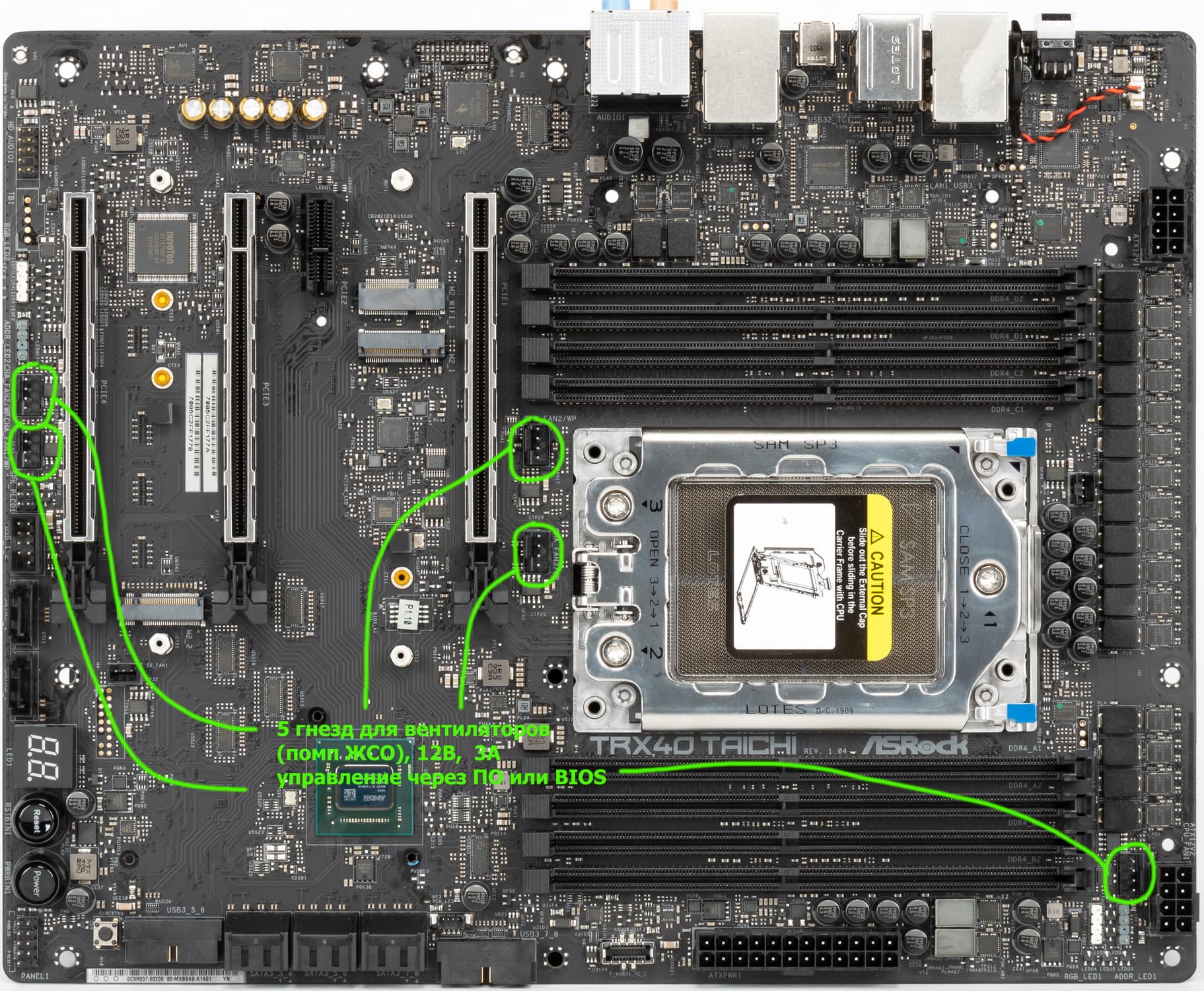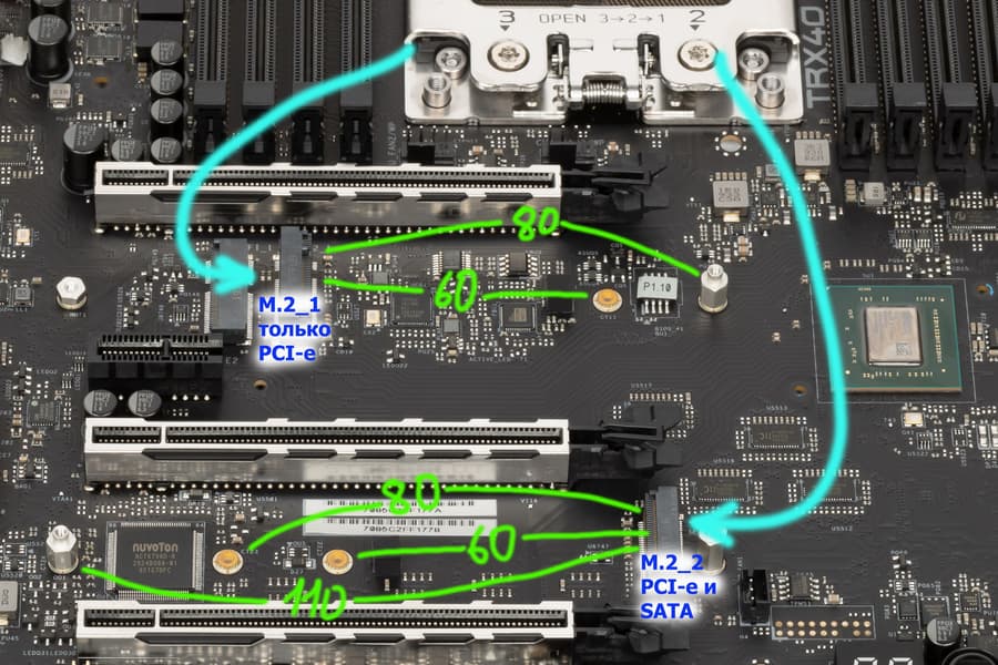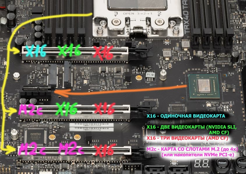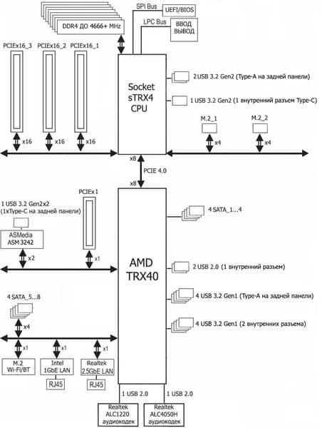 В свою очередь чипсет TRX40 обладает 24 линиями PCI-e 4.0, их которых опять же 8 зарезервированы для связи чипсета с процессором (остается свободных — 16). Далее 8 линий — свободно конфигурируются (на волю производителей матплат) (остается свободных — 8). Оставшиеся линии могут пойти либо на 8 портов SATA, либо из них можно сконфигурировать любые комбинации слотов PCI-ex1, PCI-ex2, PCI-ex4. Разумеется, и тут есть выбор у производителей материнок.