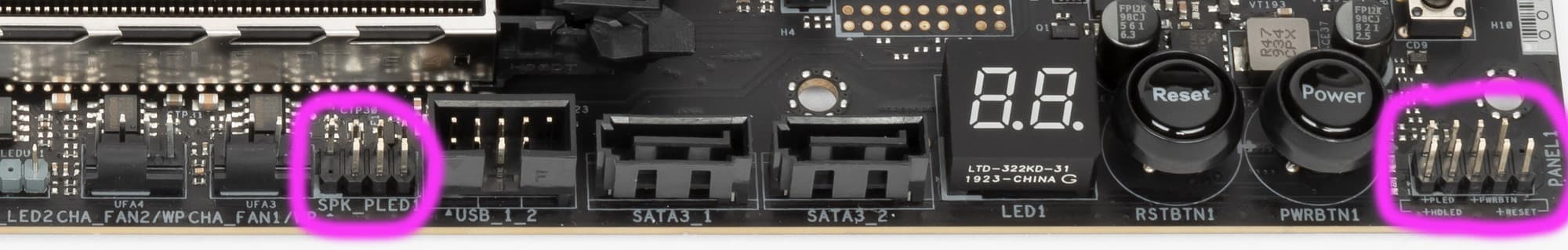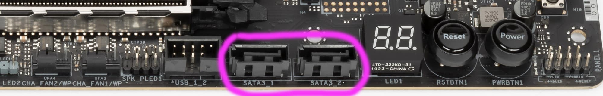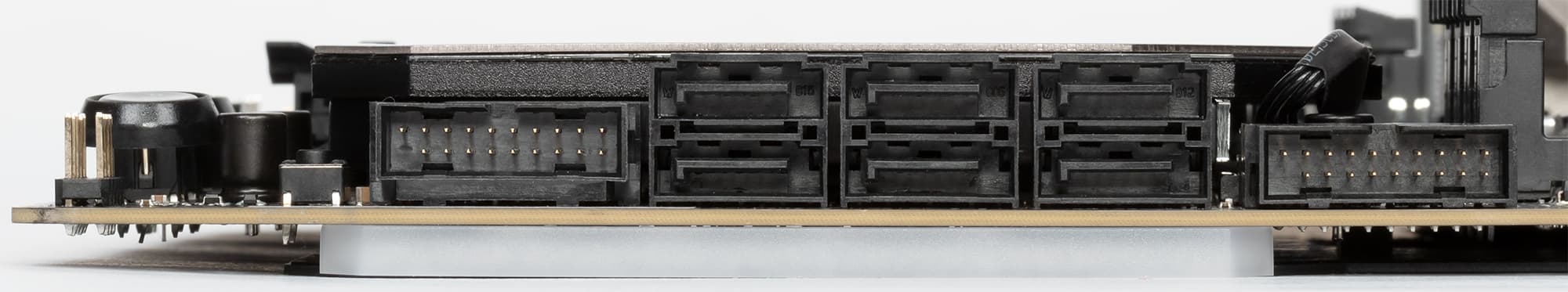 Всего у платы 8 разъемов Serial ATA 6 Гбит/с + 2 слота для накопителей в форм-факторе M.2. (Еще один слот M.2 занят контроллером беспроводных сетей Wi-Fi/Bluetooth.). Все 8 портов SATA реализованы через чипсет TRX40 (4 порта штатно, а на еще 4 порта ушли свободные PCI-e линии). 6 портов расположены на стандартном углу справа внизу и горизонтально ориентированы, а еще 2 порта SATA помещены на нижнем торце платы, при этом ориентация уже вертикальная.
