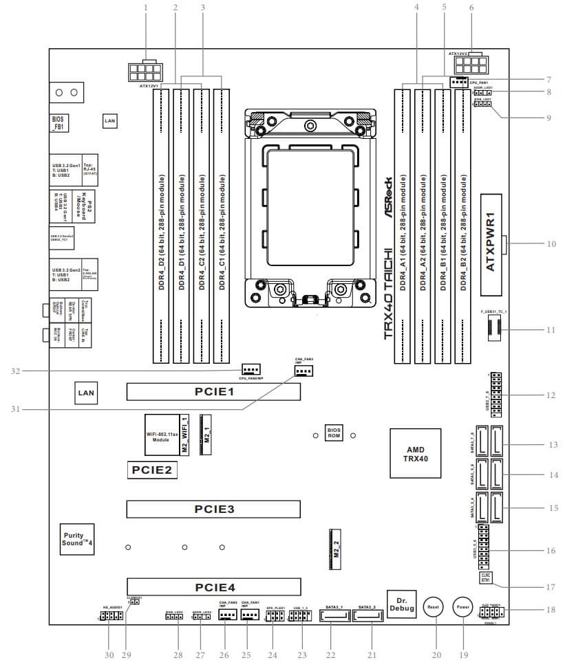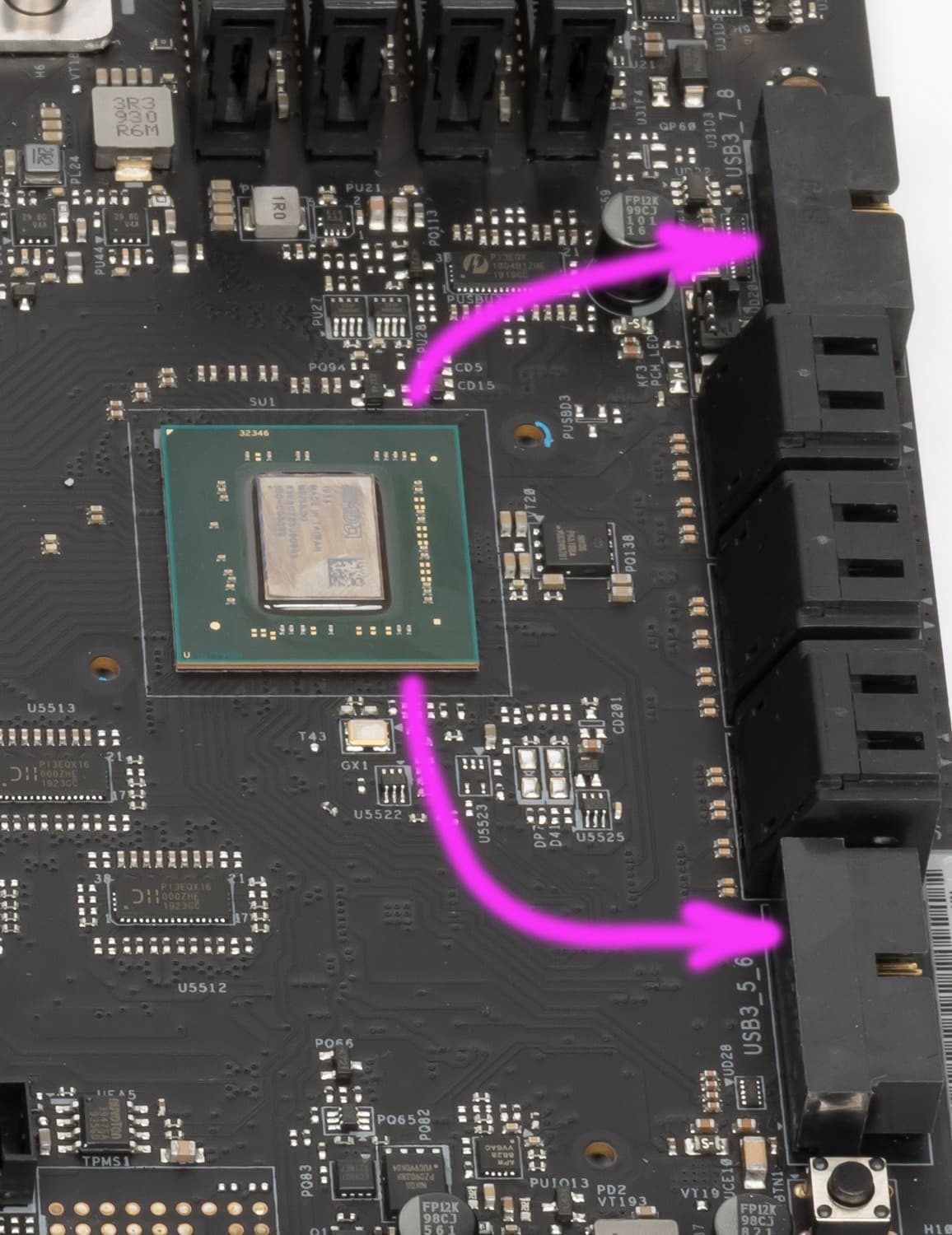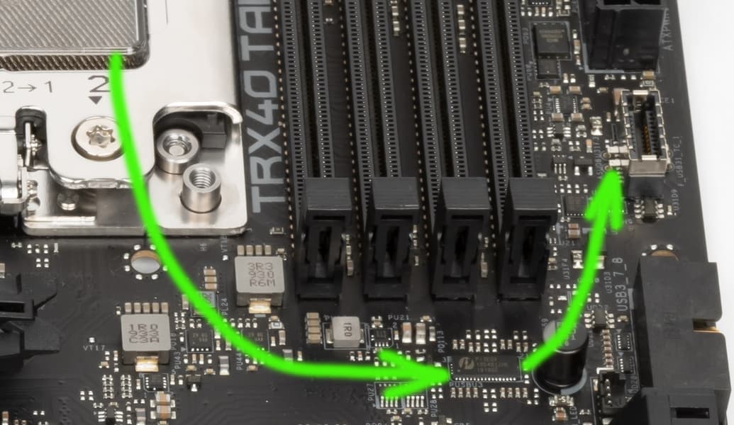 Итак, кроме USB-портов, к которым мы подойдем позже, чипсет TRX40 обладает свободными 16 PCI-e линиями. Считаем, сколько линий уходит на поддержку (связь) с тем или иным элементом именно у TRX40:
