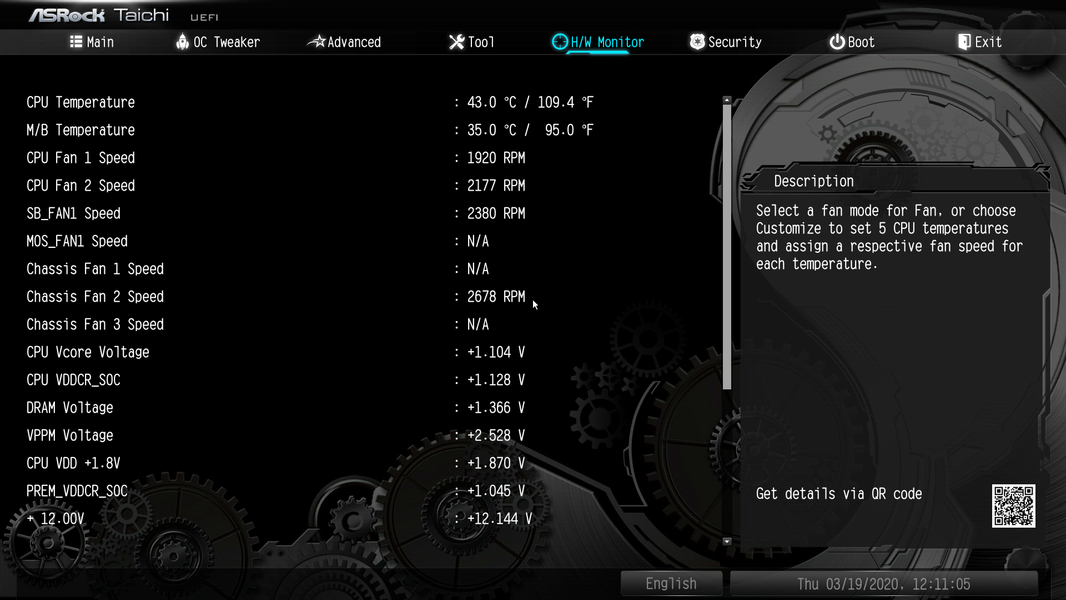 Нагрев остальных элементов материнской платы был в норме (VRM до 68 °C, чипсет TRX40 — до 79 °C). При этом чипсетный вентилятор работал на частотах до 4000 оборотов в минуту (шум почти не ощущался — установили очень хороший вентилятор), а вентиляторы на VRM практически редко включались.