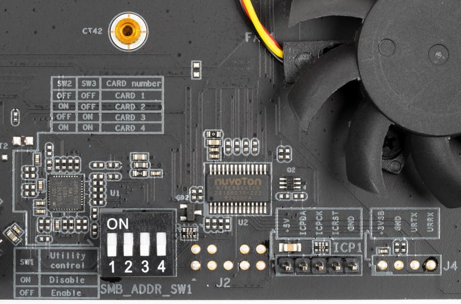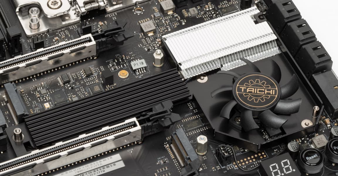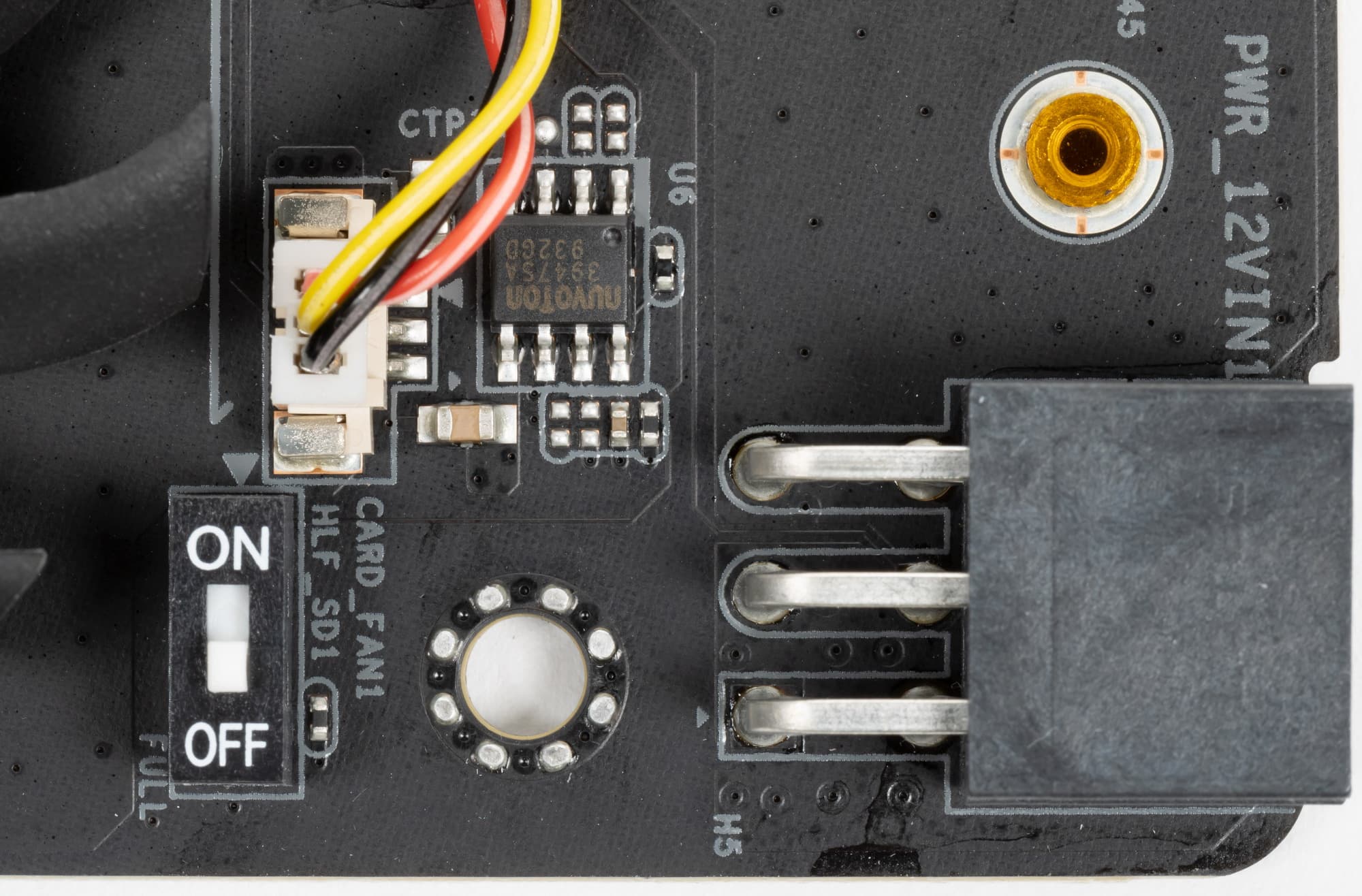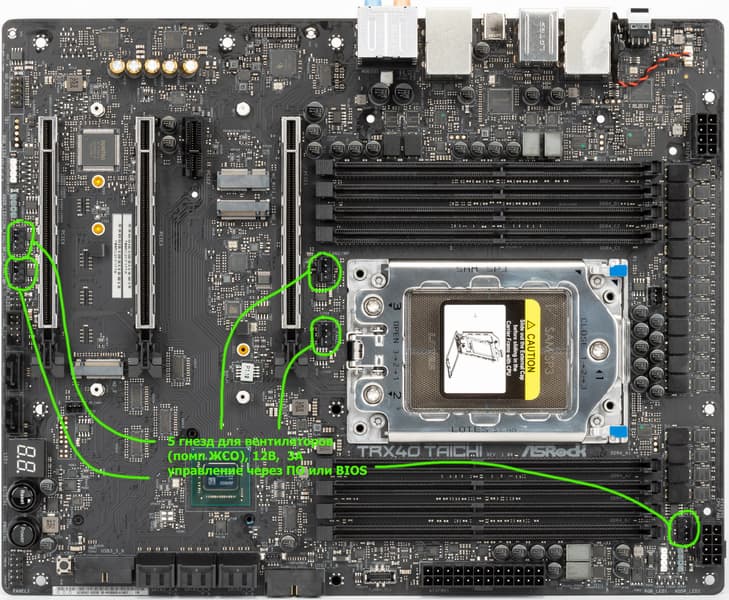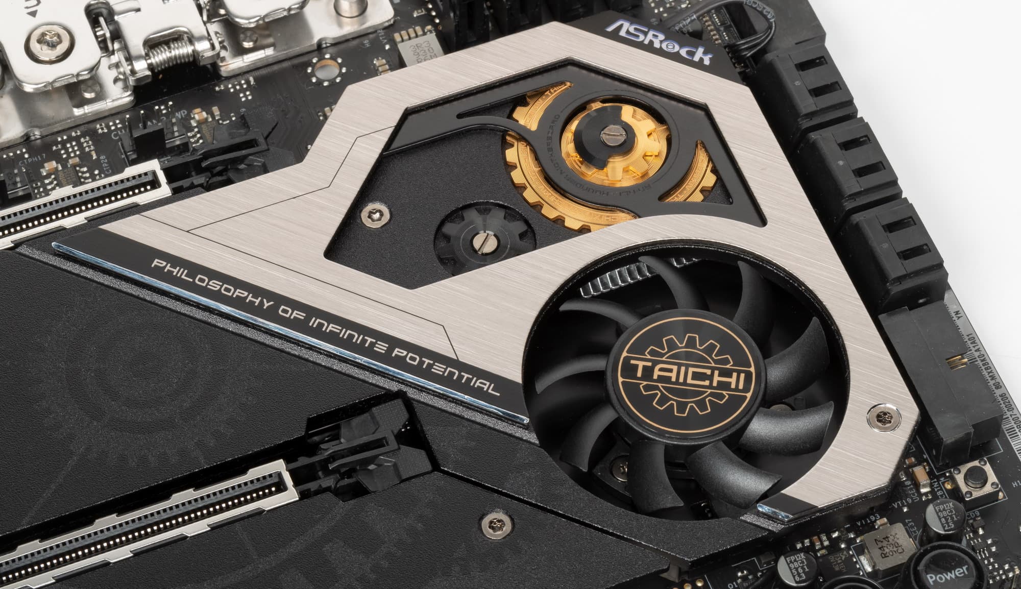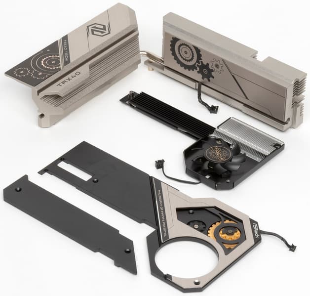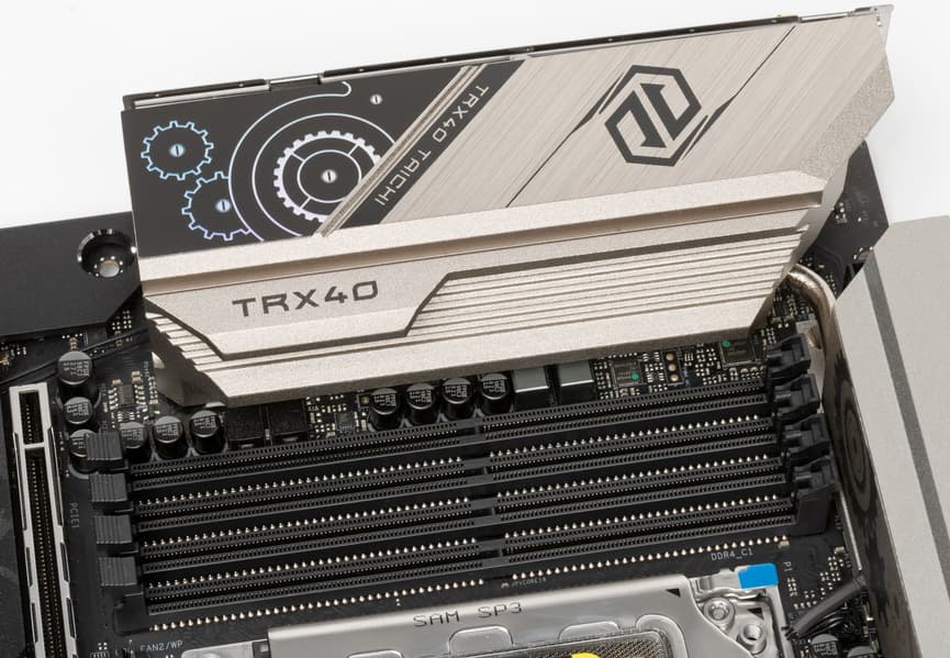 Все потенциально сильно греющиеся элементы имеют свои собственные радиаторы. Как известно, самым горячим звеном в наборе AMD TRX40 является сам чипсет, поэтому многие производители вынуждены ставить вентиляторы для такого рода микросхем.