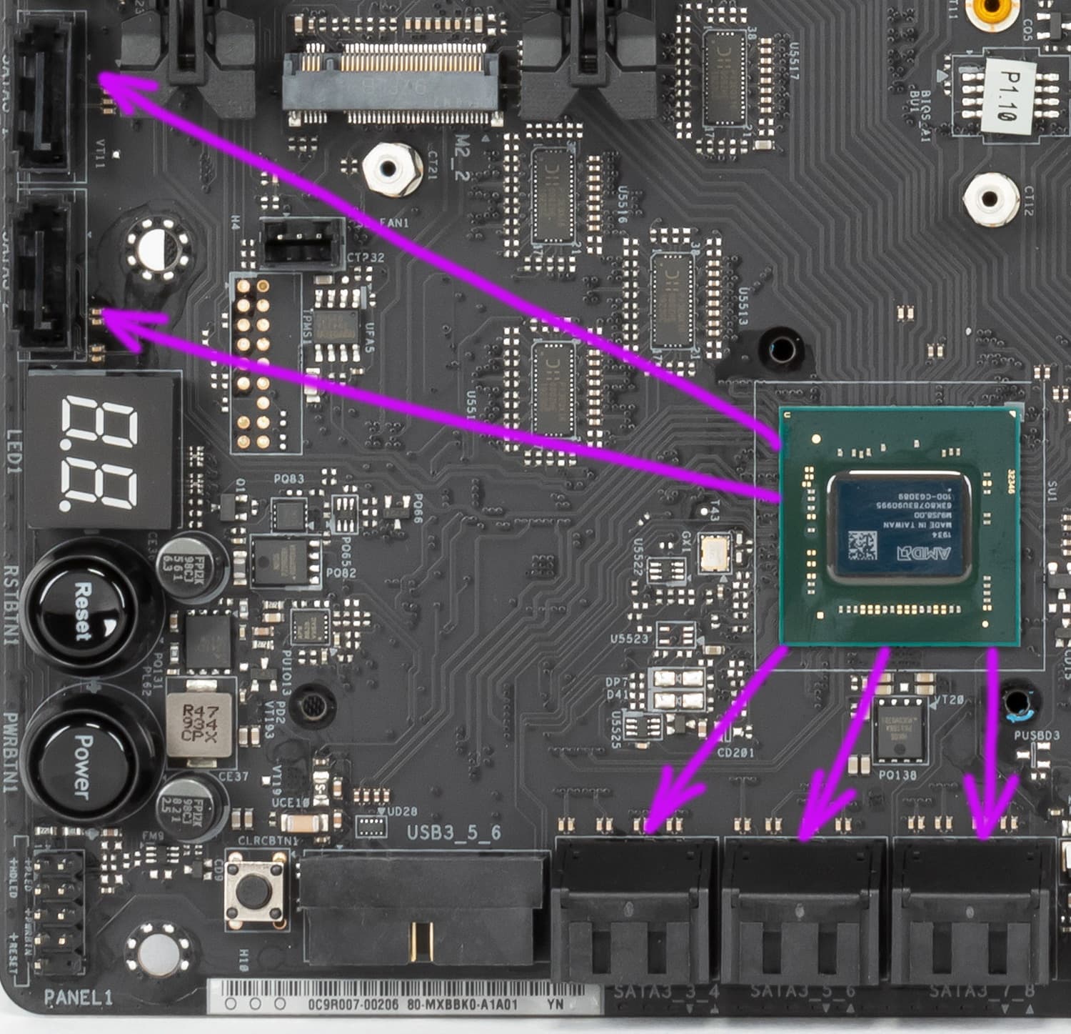 Далее, 48 линий идут на слоты PCI-ex16 (тут уже каждый производитель материнских плат волен распределять самостоятельно) (остается свободных линий — 8). Оставшиеся линии могут пойти либо на 2 слота PCI-ex4, либо на два порта M.2 с поддержкой NVMe, либо на 8 портов SATA, либо можно комбинировать порты и слоты (тут также производители матплат вольны) в рамках 8-ми линий PCI-e.