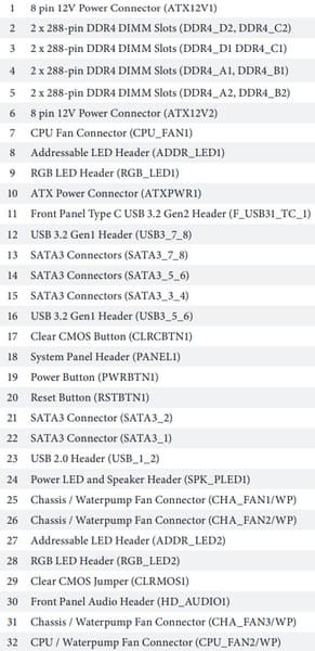 | Прочие внутренние элементы | 24-контактный разъем питания ATX 2 8-контактных разъема питания EPS12V 1 разъем для подключения порта USB 3.2 Gen2 Type-C 2 разъема для подключения 4 портов USB 3.2 Gen1 1 разъем для подключения 2 портов USB 2.0 5 разъемов для подключения 4-контактных вентиляторов (поддержка помп ЖСО) 2 разъема для подключения неадресуемой RGB-ленты 2 разъема для подключения адресуемой ARGB-ленты 1 разъем аудио для передней панели корпуса 1 разъем сброса CMOS 2 разъема для подключения управления с передней панели корпуса 1 кнопка перезагрузки Reset 1 кнопка сброса CMOS 1 кнопка включения питания Power |
