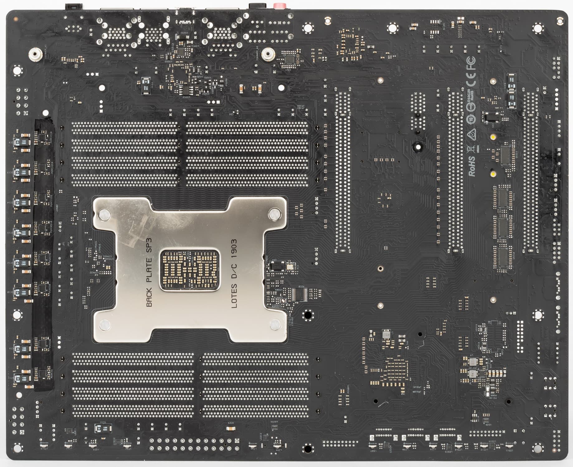На оборотной стороне элементы имеются, в частности, ряд усилителей сигнала для шины PCI-e, некоторые контроллеры и другая мелкая логика. Обработан текстолит очень хорошо: во всех точках пайки острые концы срезаны. Плата снабжена металлической защитной пластиной с оборотной стороны. Пластина не имеет изолирующего покрытия, но установлена на расстоянии 3 мм от PCB, поэтому проблем с замыканиями не должно быть.