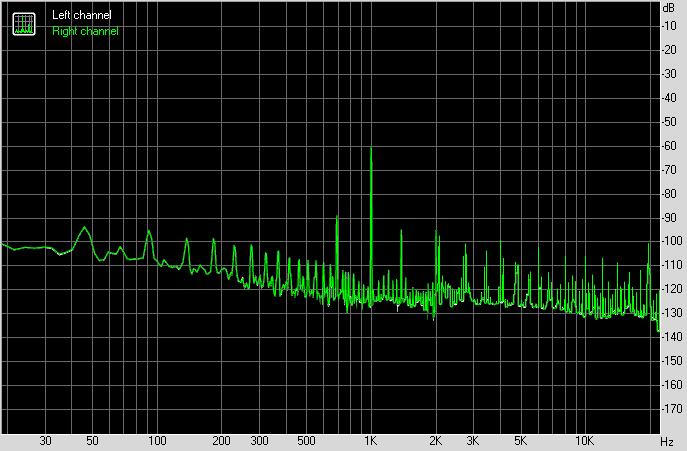Для тестирования выходного звукового тракта, предназначенного для подключения наушников или внешней акустики, мы использовали внешнюю звуковую карту Creative E-MU 0202 USB в сочетании с утилитой RightMark Audio Analyzer 6.4.5. Тестирование проводилось для режима стерео, 24-бит/44,1 кГц. Во время тестирования ИБП тестового ПК физически отключался от электросети и работал на аккумуляторе.