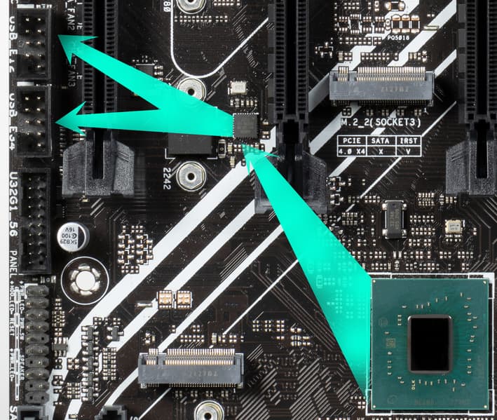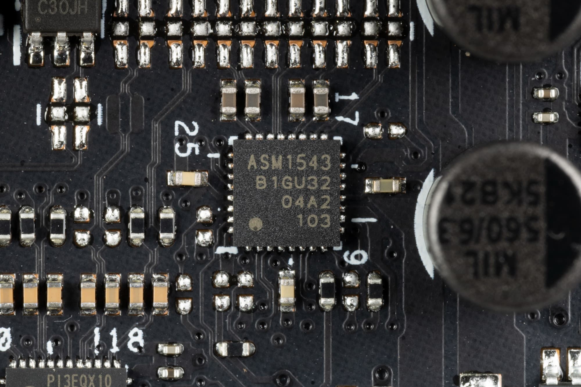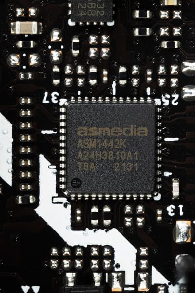 - 1 порт USB 3.2 Gen2x2: реализован с помощью двух хабов ITE IT8851 и Realtek RTS5463 (на них потрачены 2 линии USB 2.0) и представлен на задней панели портом Type-C;