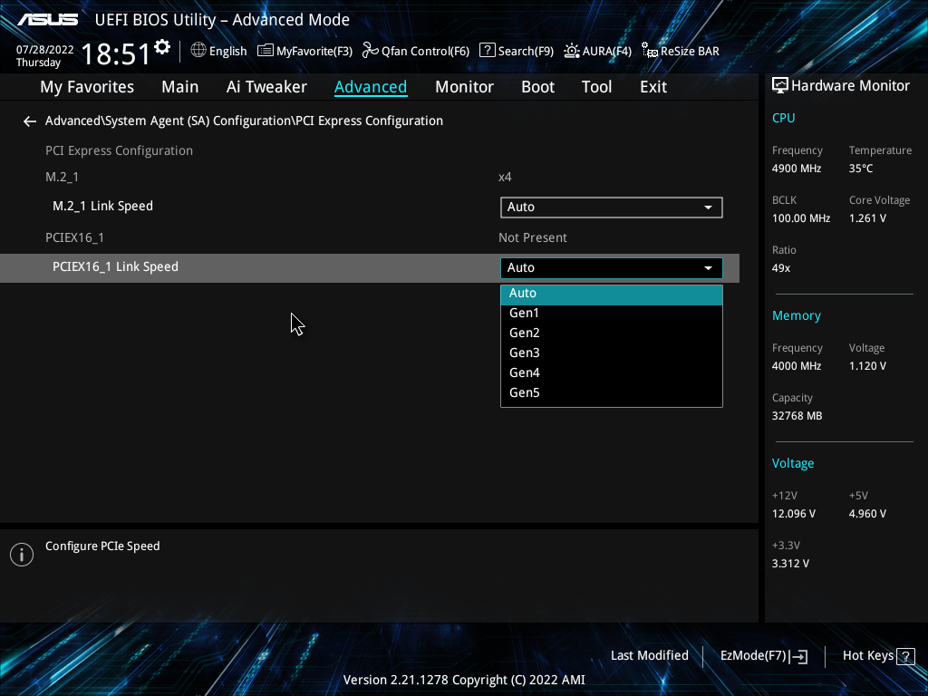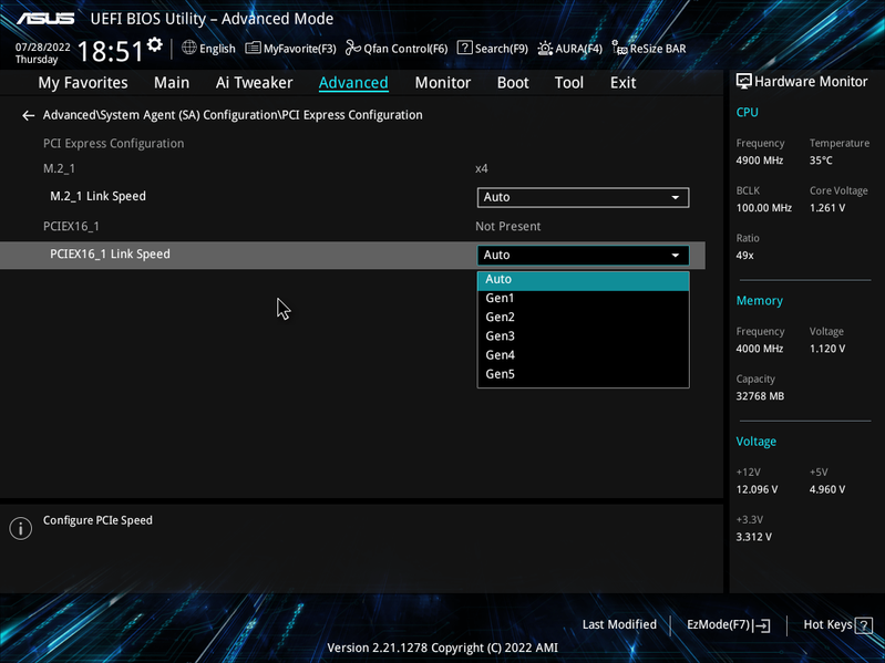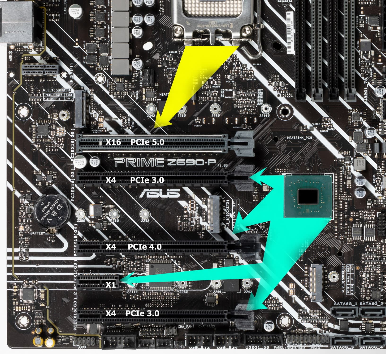 Теперь посмотрим выше на то, как работают процессоры в данной конфигурации. У CPU 12-го поколения всего 20 линий PCIe, 4 из них версии PCIe 4.0 отведены на порт М.2 (M2_1). Оставшиеся 16 линий PCIe 5.0 идут на единственный PCIe x16_1, так что вариантов переключений просто физически нет.