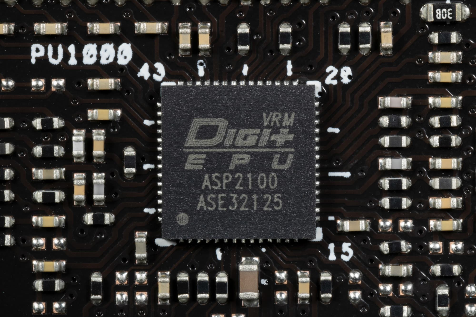 Управляет схемой VCore+iGPU фирменный ШИМ-контроллер DiGi+ ASP2100, рассчитанный максимум на 12 — 16 фаз (по разным сведениям).