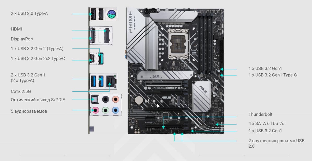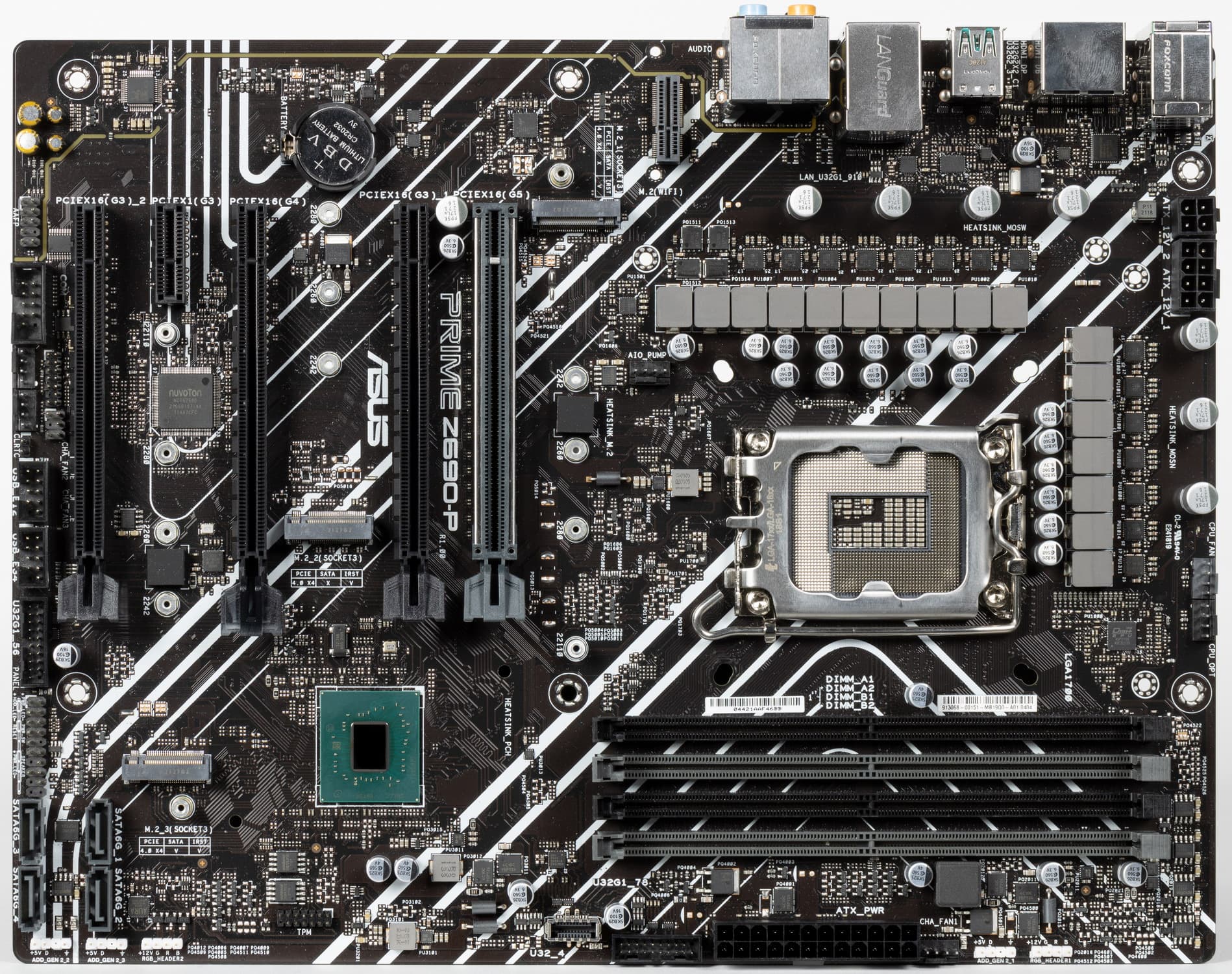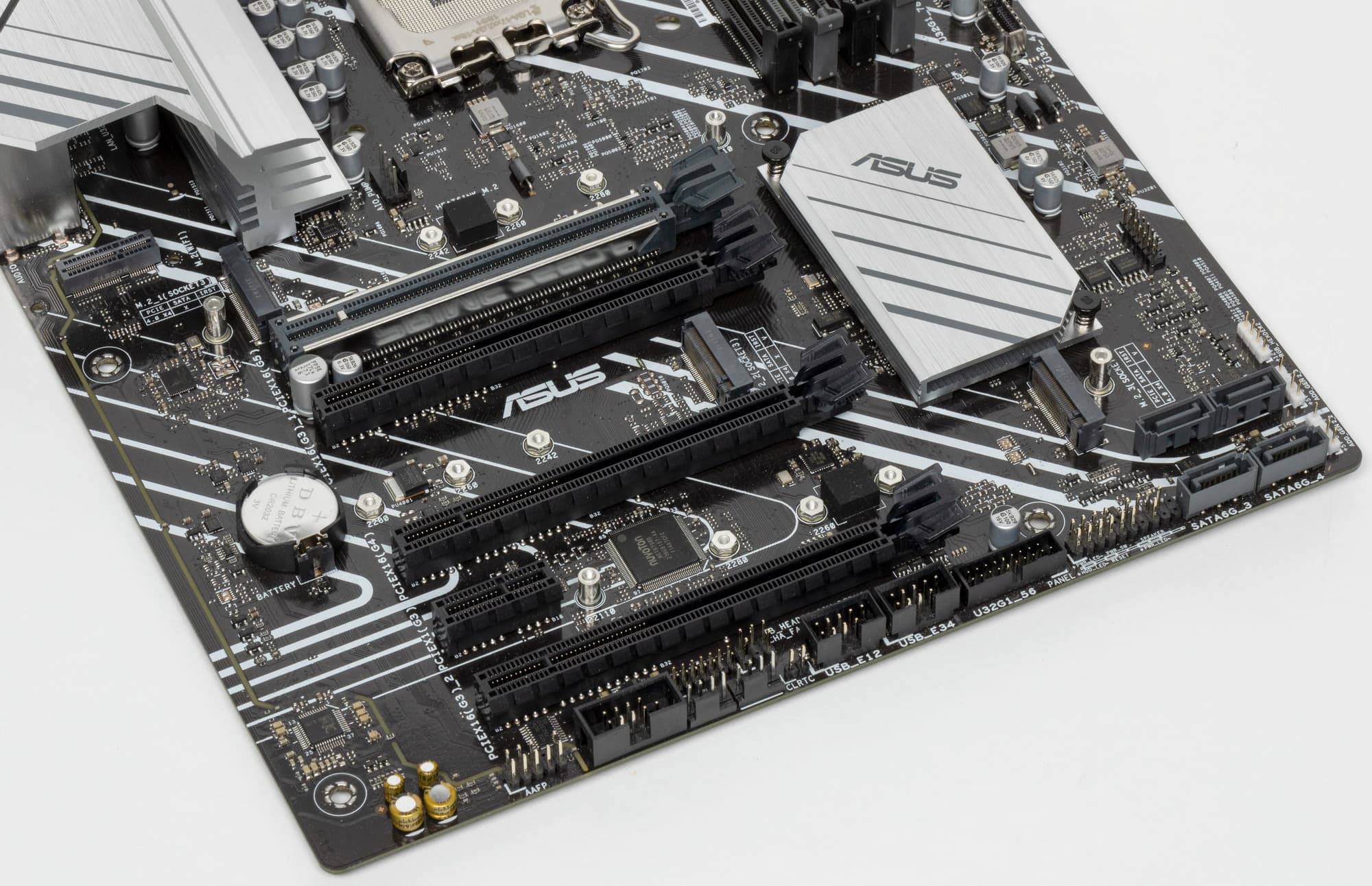 Вернемся к Asus Prime Z690-P. У нее 15 портов USB разных видов (включая 1 самый быстрый USB 3.2 Gen2×2, а также 1 USB 3.2 Gen2 и 7 USB 3.2 Gen1), 4 слота PCIe х16 (один из которых подключен к процессору 16 линиями PCIe 5.0, а остальные подключены к чипсету и работают в режиме х4), 1 слот PCIe x1, 3 слота M.2 (один из них подключен напрямую к процессору линиями PCIe 4.0, два других подключены к чипсету Z690 линиями PCIe 4.0), 4 порта SATA и 6 разъемов для вентиляторов. В принципе, для модели такого уровня поддержка периферии очень достойная.