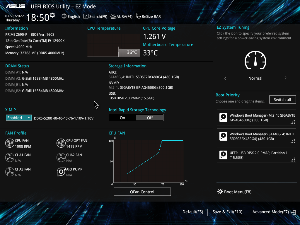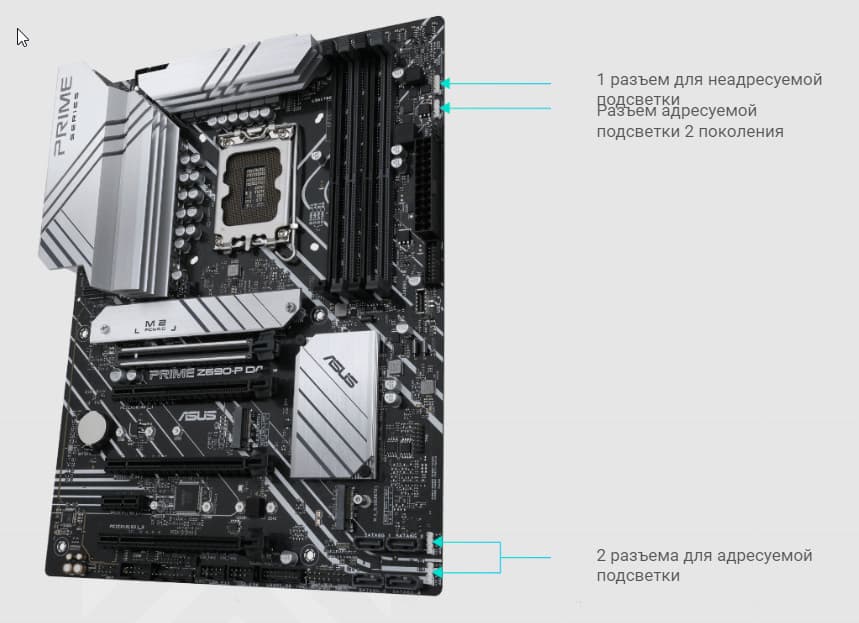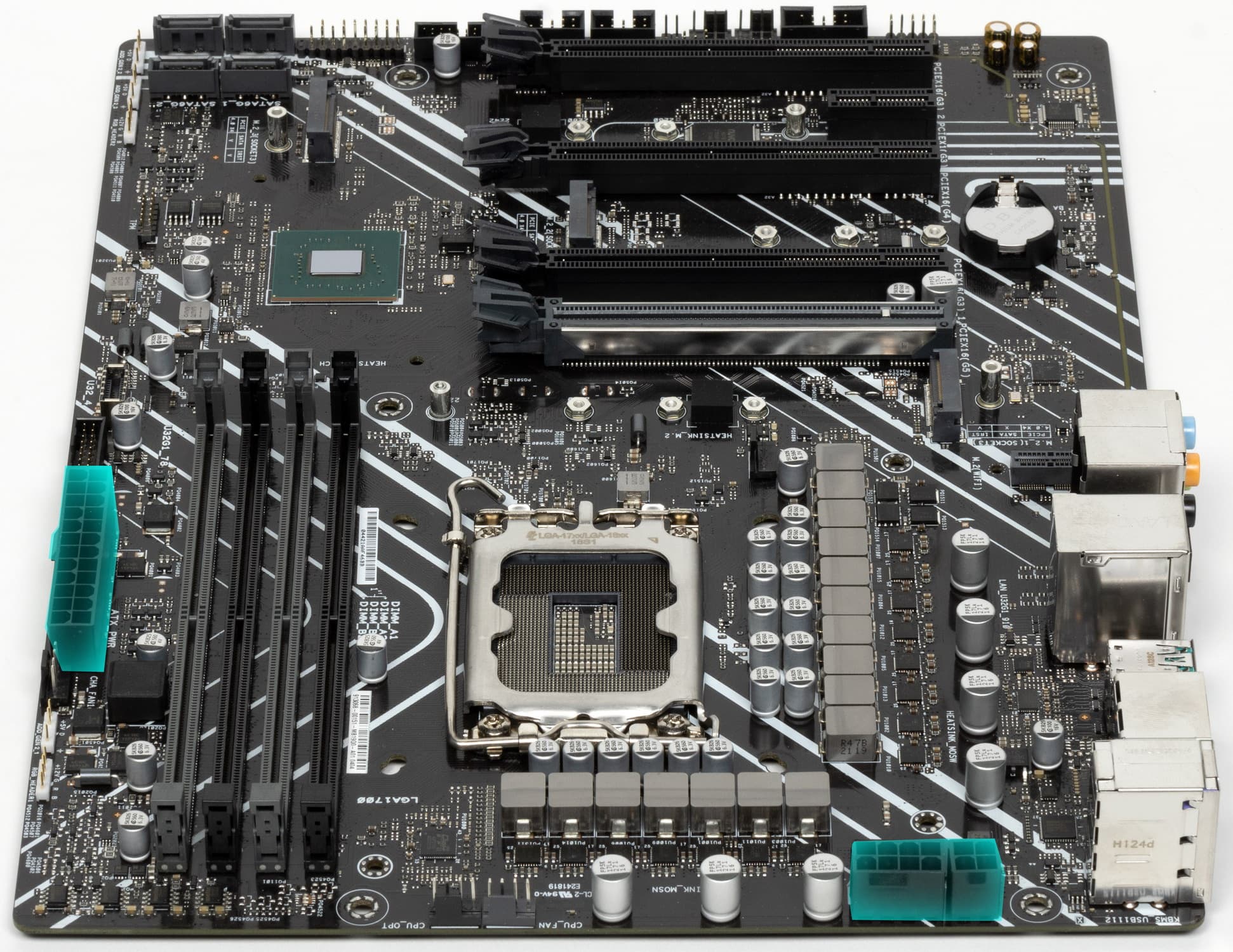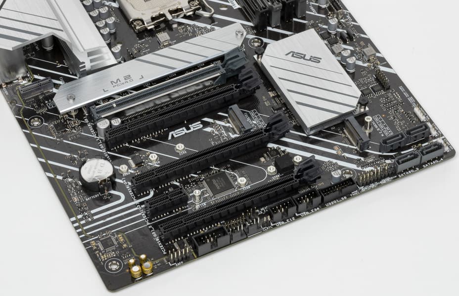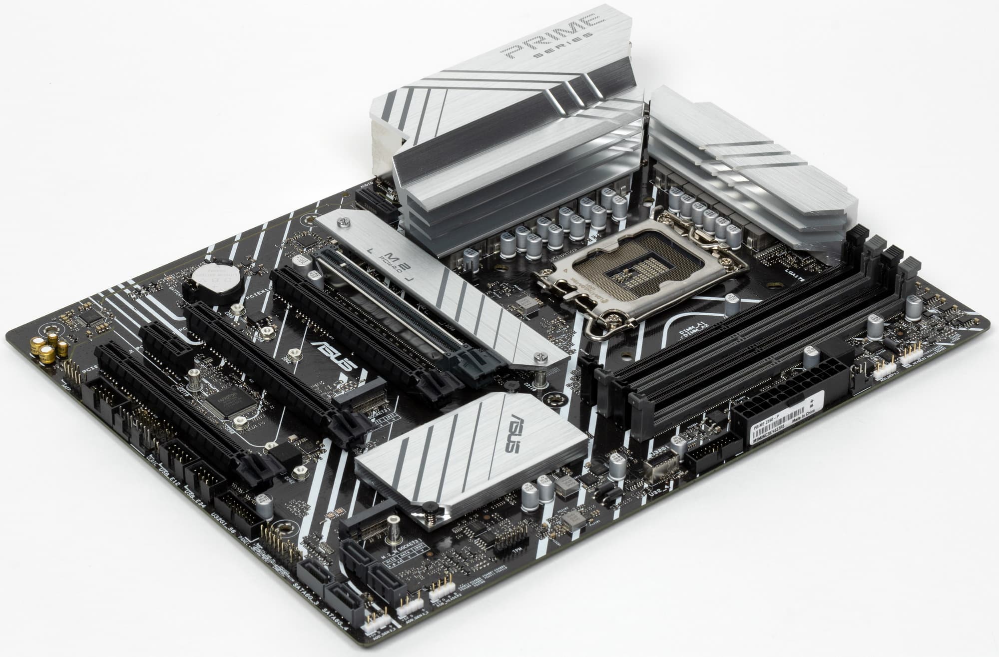 Вернемся к Asus Prime Z690-P. У нее 15 портов USB разных видов (включая 1 самый быстрый USB 3.2 Gen2×2, а также 1 USB 3.2 Gen2 и 7 USB 3.2 Gen1), 4 слота PCIe х16 (один из которых подключен к процессору 16 линиями PCIe 5.0, а остальные подключены к чипсету и работают в режиме х4), 1 слот PCIe x1, 3 слота M.2 (один из них подключен напрямую к процессору линиями PCIe 4.0, два других подключены к чипсету Z690 линиями PCIe 4.0), 4 порта SATA и 6 разъемов для вентиляторов. В принципе, для модели такого уровня поддержка периферии очень достойная.