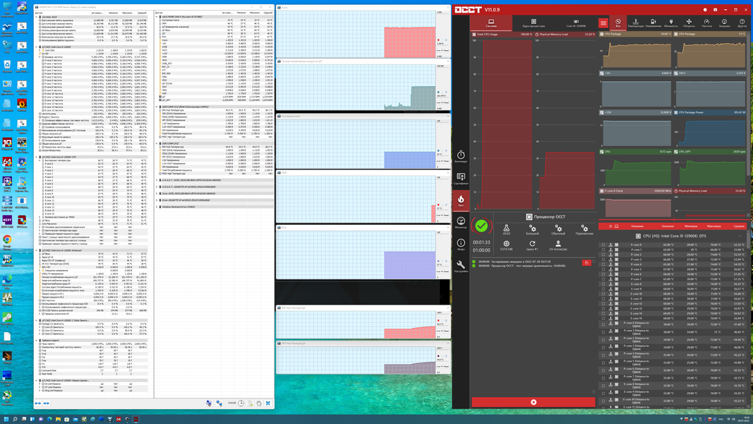 Ну что же, снова мы видим очень хороший авторазгон на прежнем уровне: 4,9 ГГц по всем Р-ядрам и 3,7 ГГц по всем Е-ядрам. То есть программная система Turbo Boost, определив мощное питание, выставила очень высокие частоты работы.