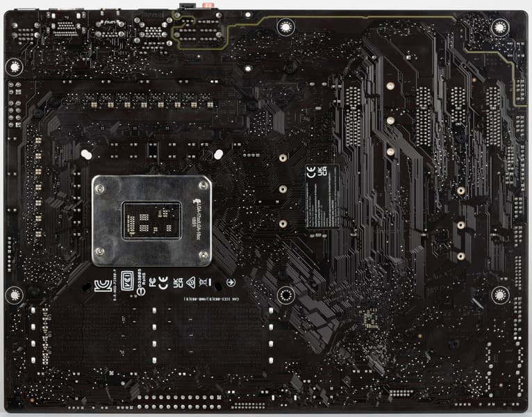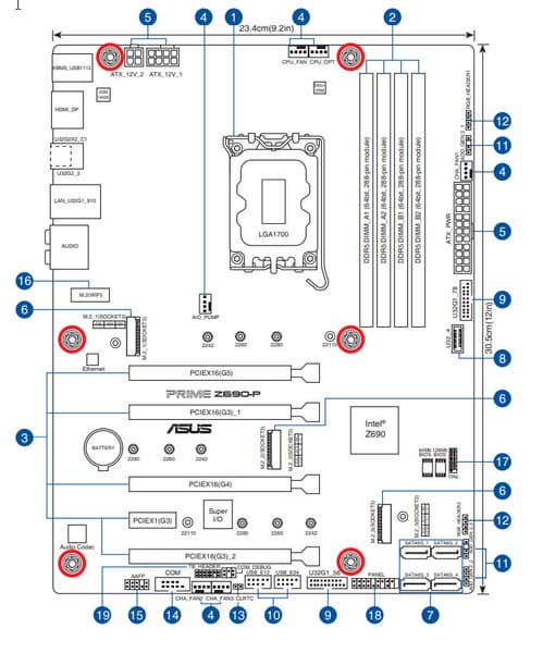 Форм-фактор ATX имеет размеры до 305×244 мм, а E-ATX — до 305×330 мм. Материнская плата Asus Prime Z690-P имеет размеры 305×234 мм, поэтому выполнена в форм-факторе ATX, и на ней имеются 6 монтажных отверстий для установки в корпус. Почему шесть, а не девять (стандарт) ? А просто потому, что плата более узкая, нежели обычно привычные нам ATX-матплаты: 234 мм по ширине, а не 244, именно потому боковая грань материнки «не достает» до трех монтажных втулок в корпусе ровно на 1 см.