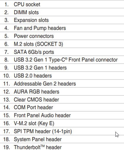 | Прочие внутренние элементы | 24-контактный разъем питания ATX 1 8-контактный разъем питания EPS12V 1 4-контактный разъем питания EPS12V 1 разъем для подключения порта USB 3.2 Gen1 Type-C 2 разъема для подключения 4 портов USB 3.2 Gen1 2 разъема для подключения 4 портов USB 2.0 6 разъемов для подключения 4-контактных вентиляторов и помп ЖСО 1 разъем для подключения неадресуемой RGB-ленты 3 разъема для подключения адресуемой ARGB-ленты 1 разъем аудио для передней панели корпуса 1 разъем Thunderbolt 1 разъем COM-port 1 разъем TPM для устройств безопасности 2 разъема для подключения управления с передней панели корпуса |