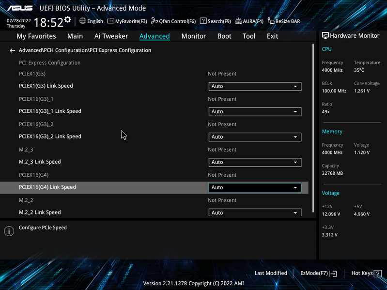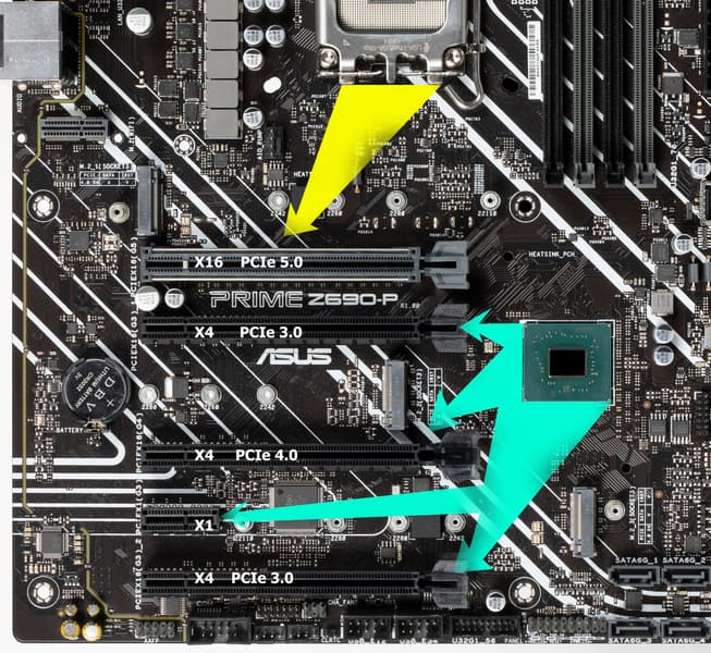 Кроме USB-портов, к которым мы подойдем позже, чипсет Z690 обладает 28 PCIe линиями. Считаем, сколько линий уходит на поддержку (связь) с тем или иным элементом (надо учитывать, что 28 линий не единой версии, а 12 линий PCIe 4.0 и 16 линий PCIe 3.0):