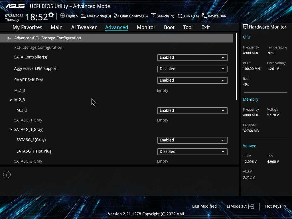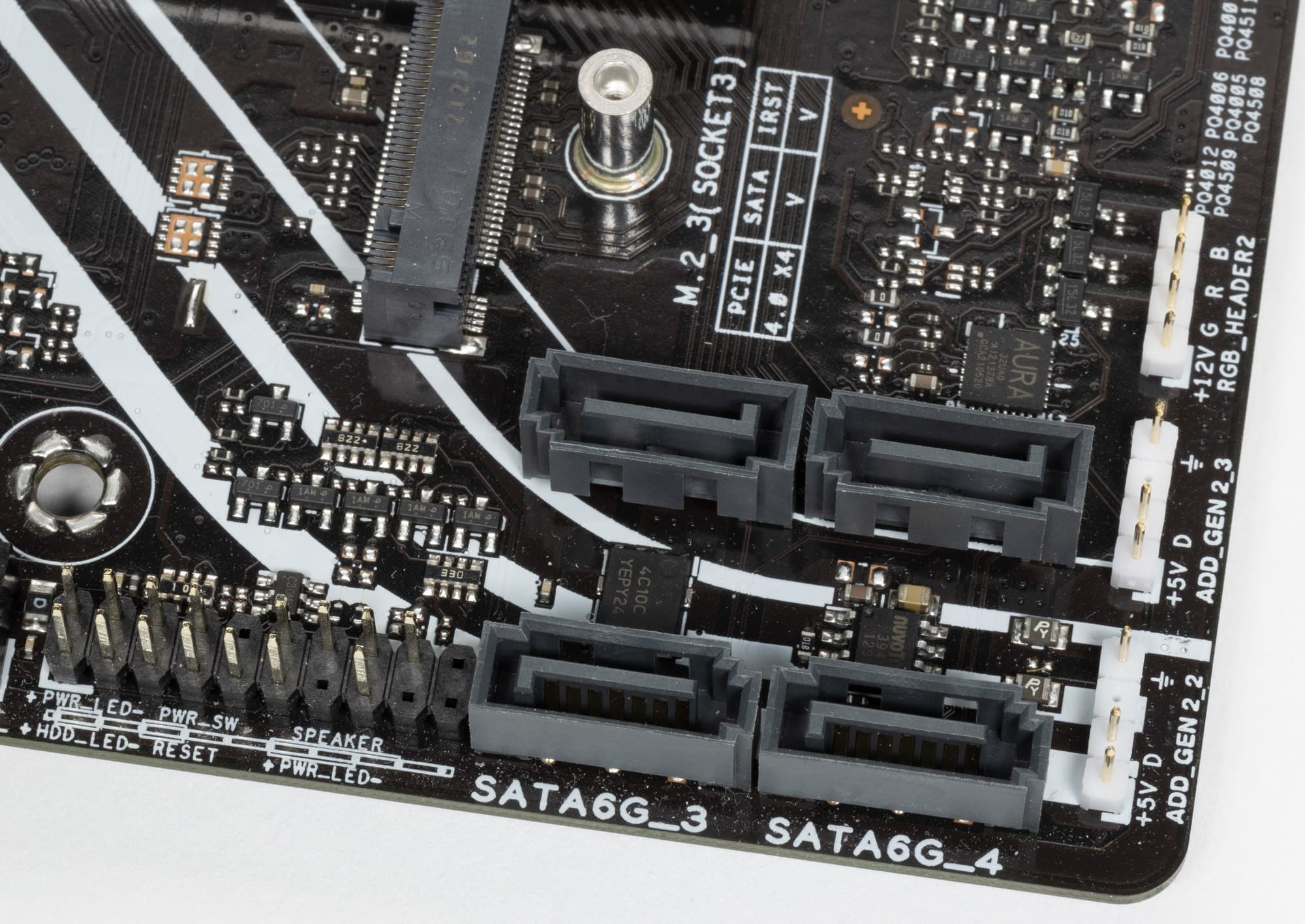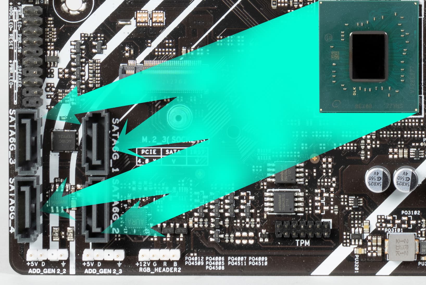 Всего у платы 4 разъема Serial ATA 6 Гбит/с + 3 слота для накопителей в форм-факторе M.2. 4 порта SATA 1,2,3,4 реализованы через чипсет Z690 и поддерживают создание RAID.