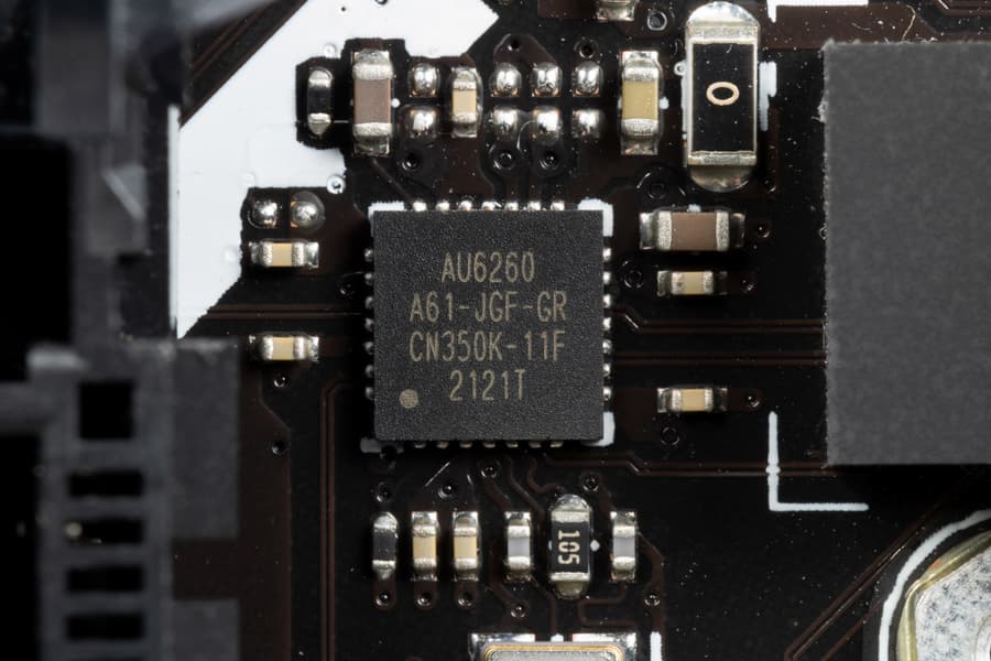 - 6 портов USB 2.0/1.1: 4 реализованы через хаб Alcor Link AU6260 (на него потрачена 1 линия PCIe 3.0 от Z690) и представлены двумя внутренними разъемами (каждый на 2 порта); еще 2 реализованы через Z690 и представлены на задней панели портами Type-A (черного цвета). Но есть нюанс!