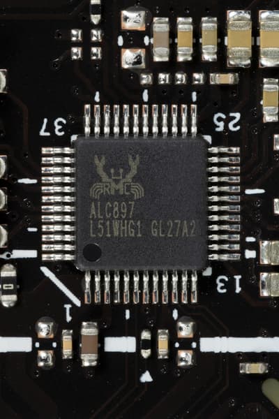 Мы знаем, что почти во всех современных материнских платах звуковым кодеком является продукт от Realtek, обеспечивающий вывод звука по схемам до 7.1, в последнее время это стал ALC4080 с характеристиками 32 бит / 384 кГц. Однако в данном случае применен очень старый Realtek ALC897.
