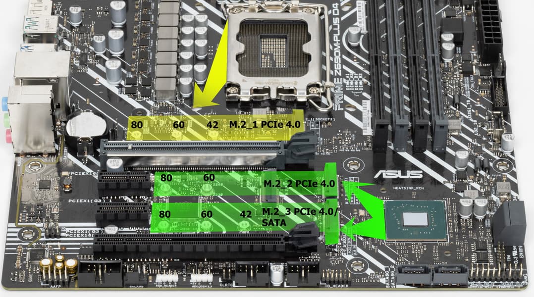 Второй и третий слоты M.2 (M2_2, M2_3) получают данные от чипсета Z690, а первый — от CPU (PCIe 4.0). При этом только М2_3 (PCIe 4.0) поддерживает модули с любым интерфейсом, а все остальные работают с модулями только с PCIe интерфейсом.
