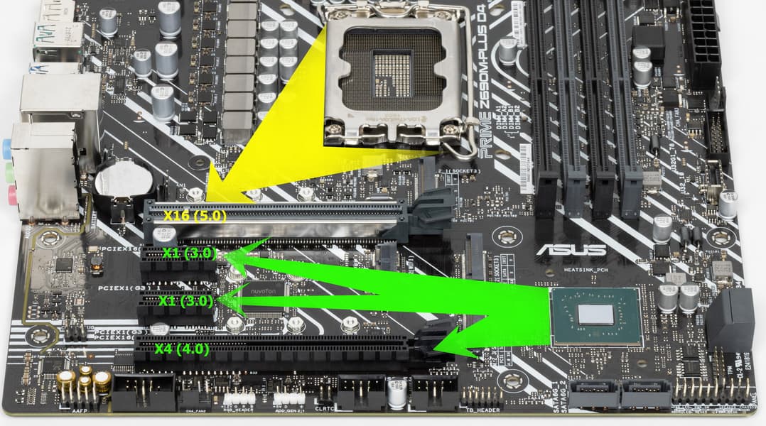 Теперь в целом про слоты PCIe. Всего на плате есть 4 слота: два PCIe x16 (для видеокарт или других устройств) и два PCIe x1. Если про первый PCIe x16_1 я выше уже рассказал (он подключен к CPU), то PCIe x16_2 подключен к Z690, однако физически он получает лишь 4 линии PCIe 4.0.