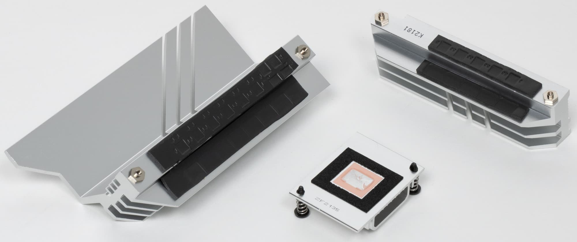 Как мы видим, охлаждение чипсета организовано с помощью отдельного небольшого радиатора. VRM-секция имеет свои два раздельных радиатора.
