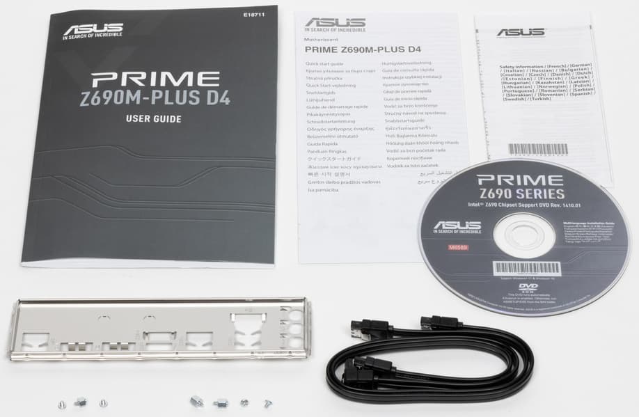 Кроме традиционных элементов типа руководства пользователя и кабелей SATA, комплект поставки включает винтики для М.2 слотов, накопитель с ПО, «заглушку» на заднюю панель и ... все.