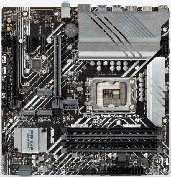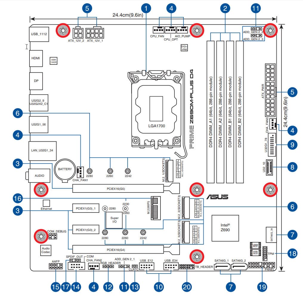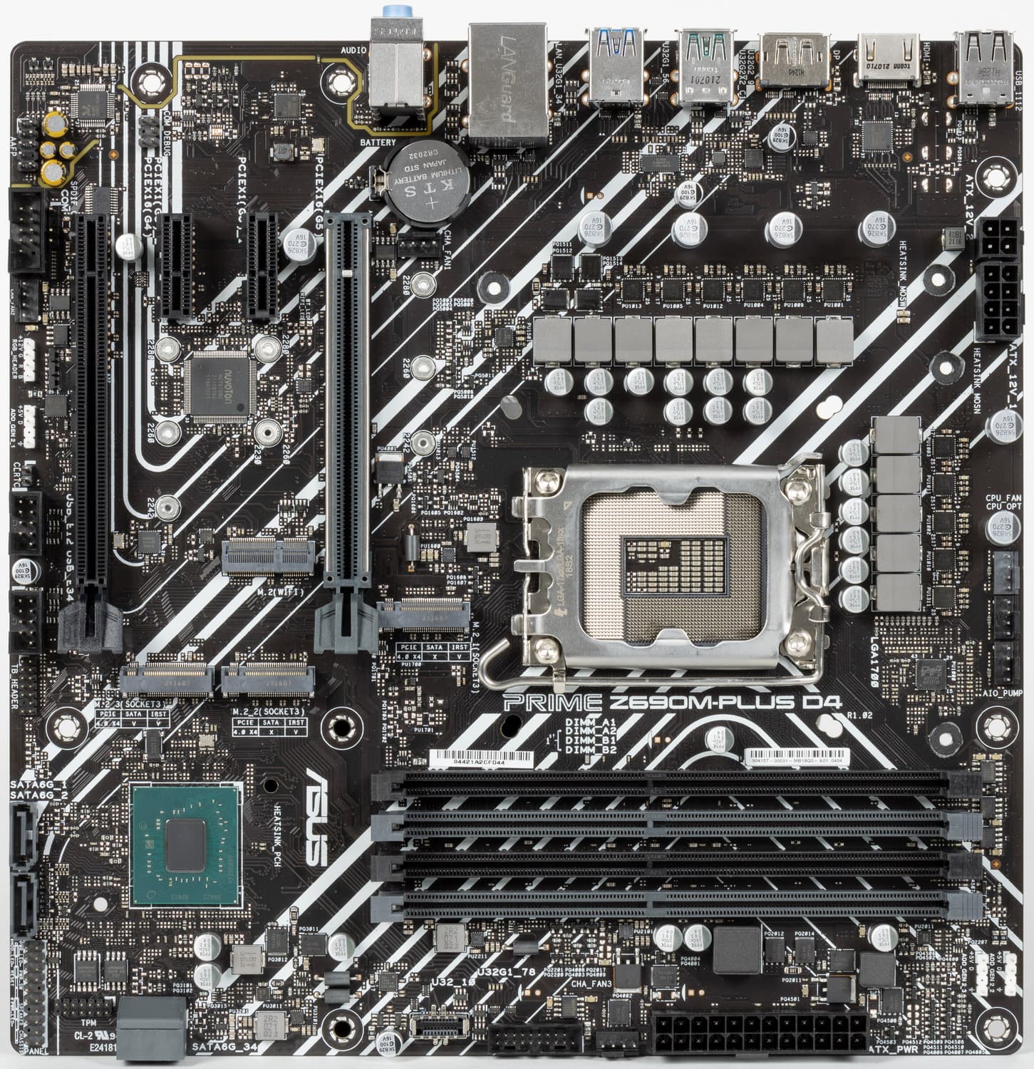 Форм-фактор Mini-ITX имеет размеры 170×170 мм, microATX — до 244×244 мм, ATX — до 305×244 мм, а E-ATX — до 305×330 мм. Материнская плата Asus Prime Z690M-Plus D4 имеет размеры 244×244 мм, поэтому выполнена в форм-факторе microATX, и на ней имеются 8 монтажных отверстий для установки в корпус.