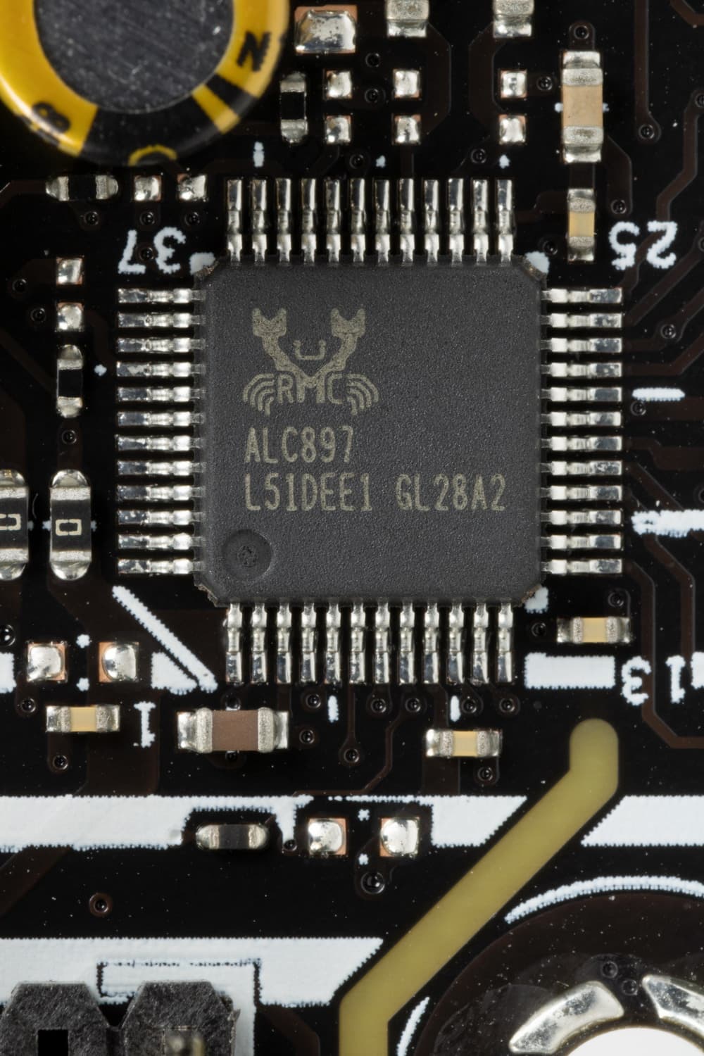 Мы знаем, что почти во всех современных материнских платах звуковым кодеком является продукт от Realtek, обеспечивающий вывод звука по схемам до 7.1, в последнее время это стал ALC4080 с характеристиками 32 бит / 384 кГц. Однако в данном случае применен очень старый Realtek ALC897.