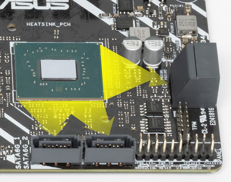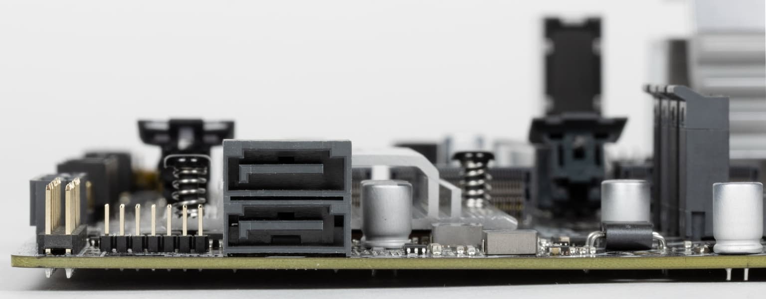 Всего у платы 4 разъема Serial ATA 6 Гбит/с + 3 слота для накопителей в форм-факторе M.2. 4 порта SATA 1,2,3,4 реализованы через чипсет Z690 и поддерживают создание RAID. При этом порты расположены по-парно у нижнего правого угла матплаты: порты 1 и 2 ориентированы вертикально, а 3 и 4 — горизонтально.