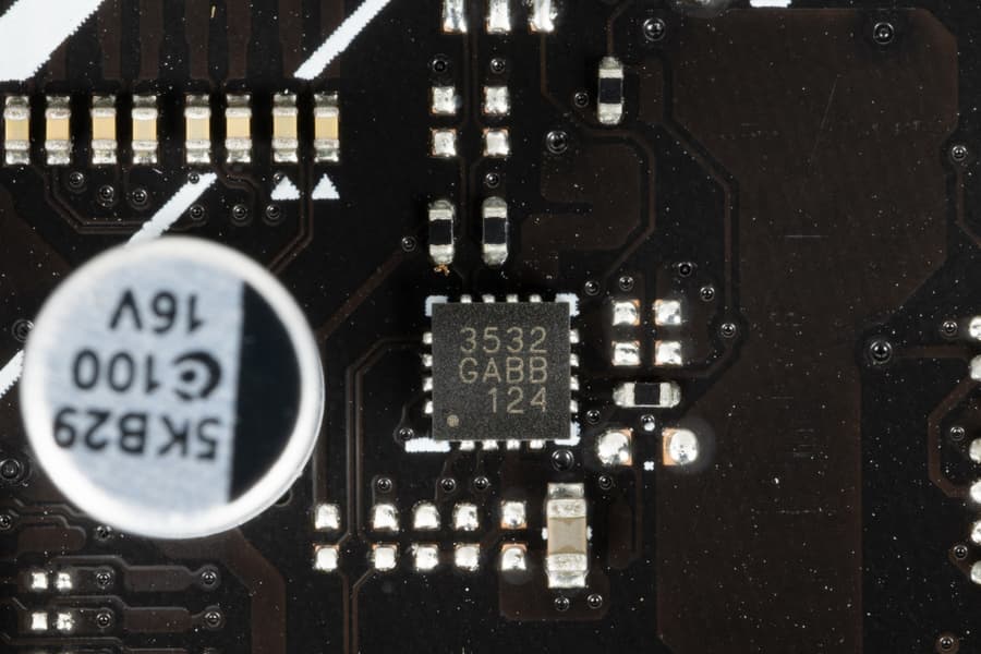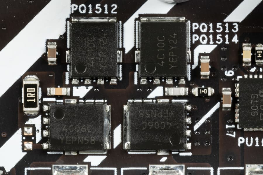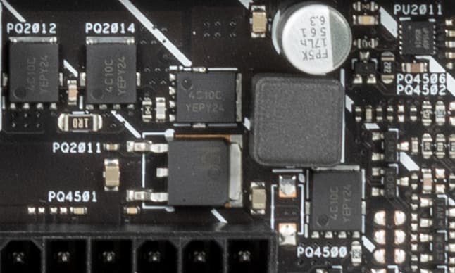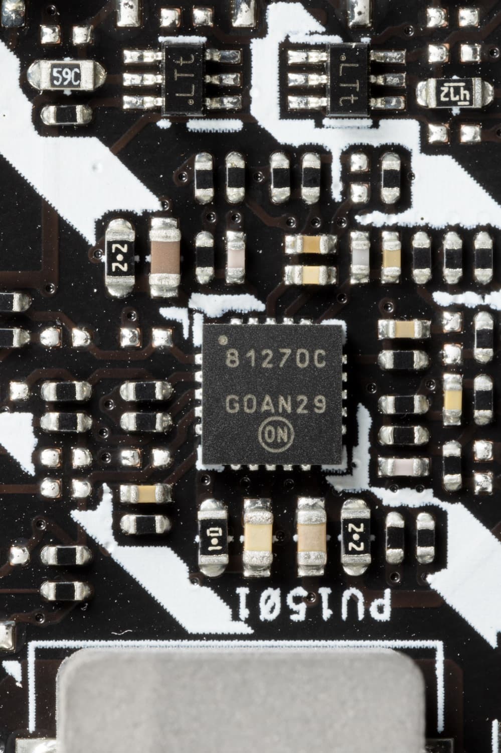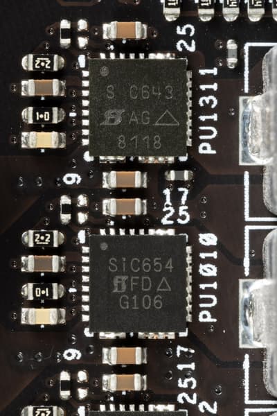 Каждый канал фаз для VCore, iGPU имеет суперферритовый дроссель и SiC643/654 MOSFET от Vishay на 50/60 А.