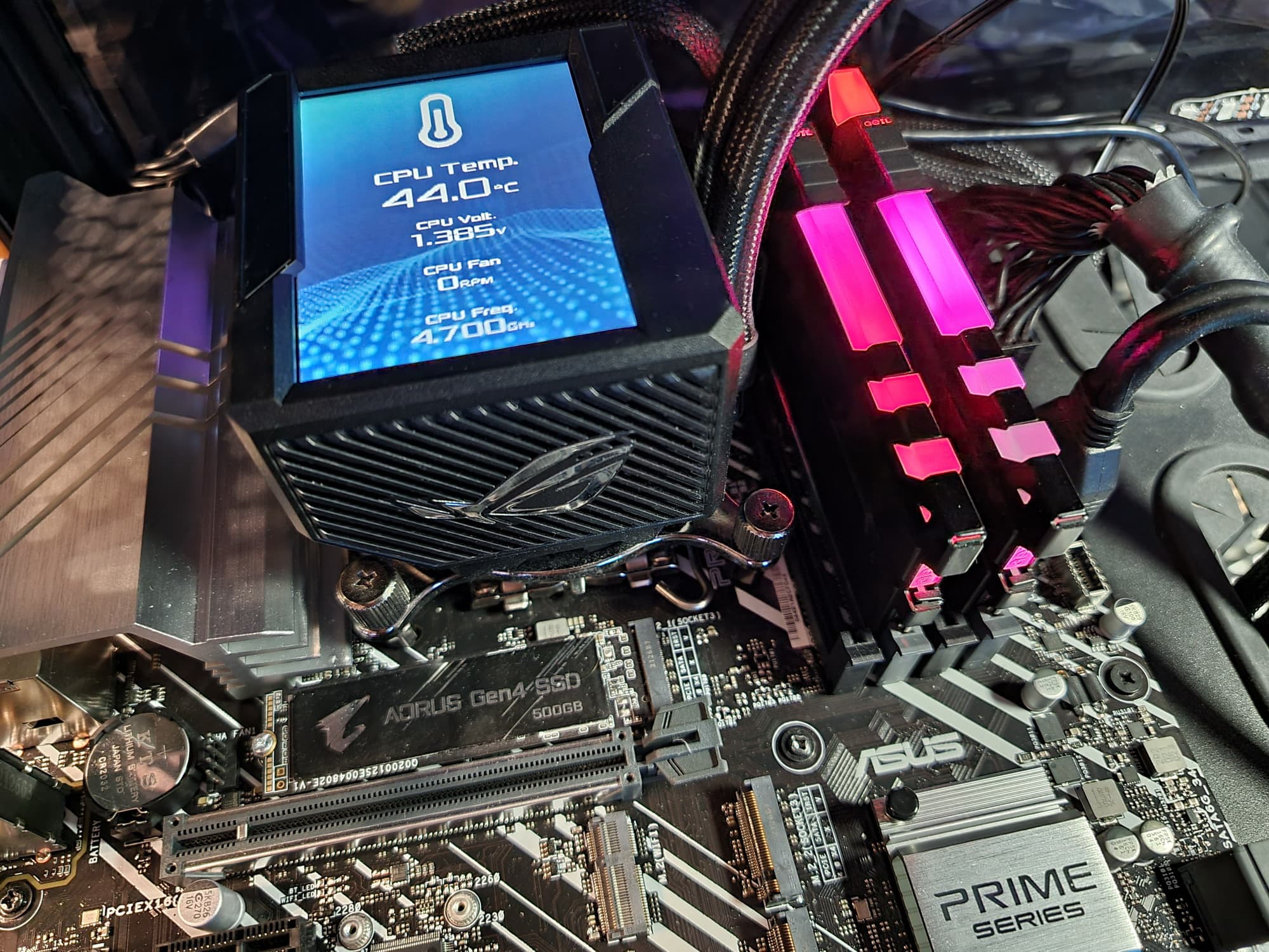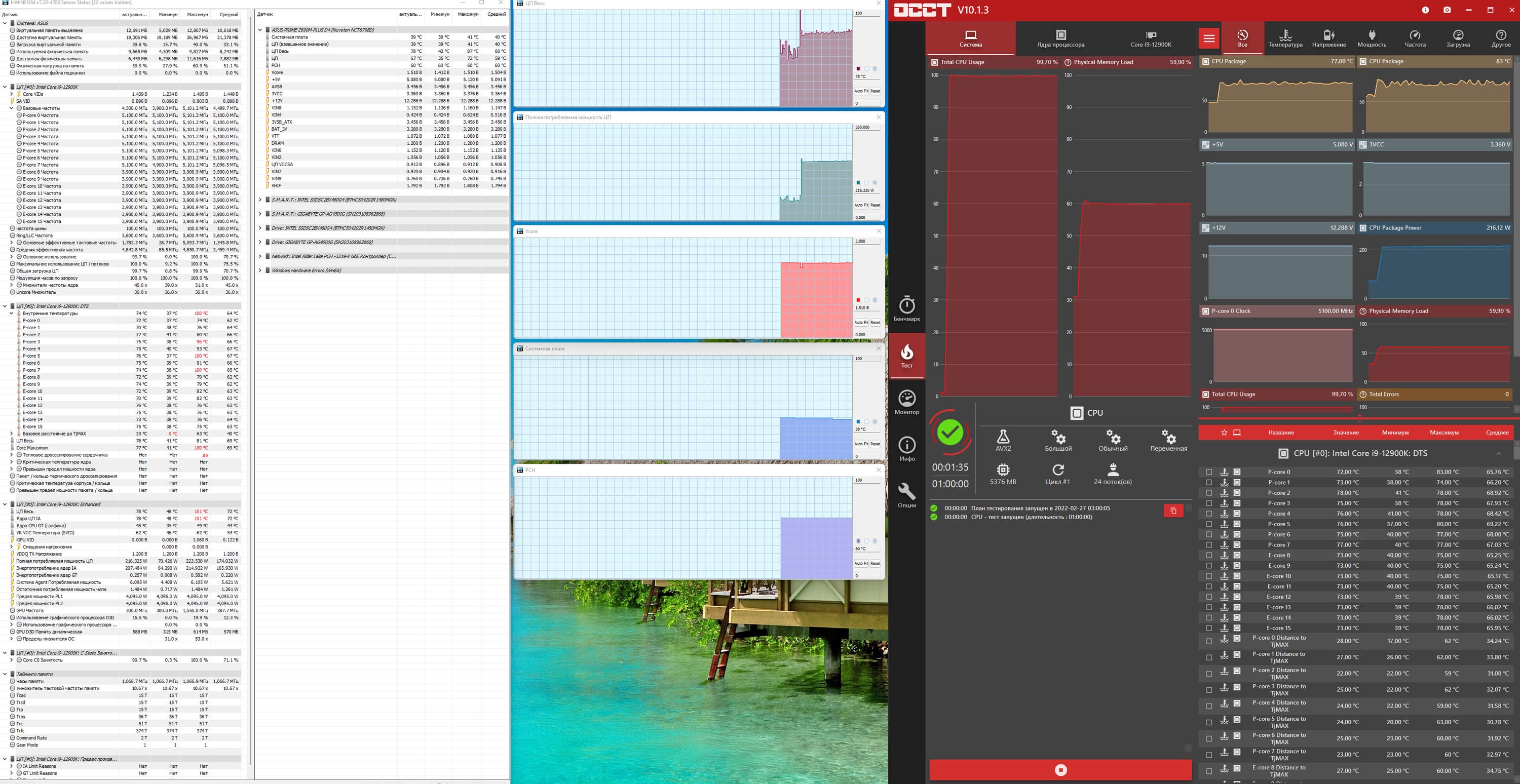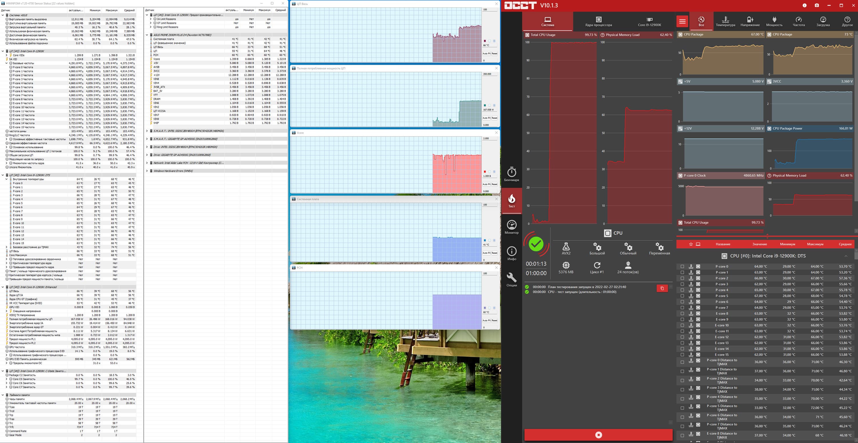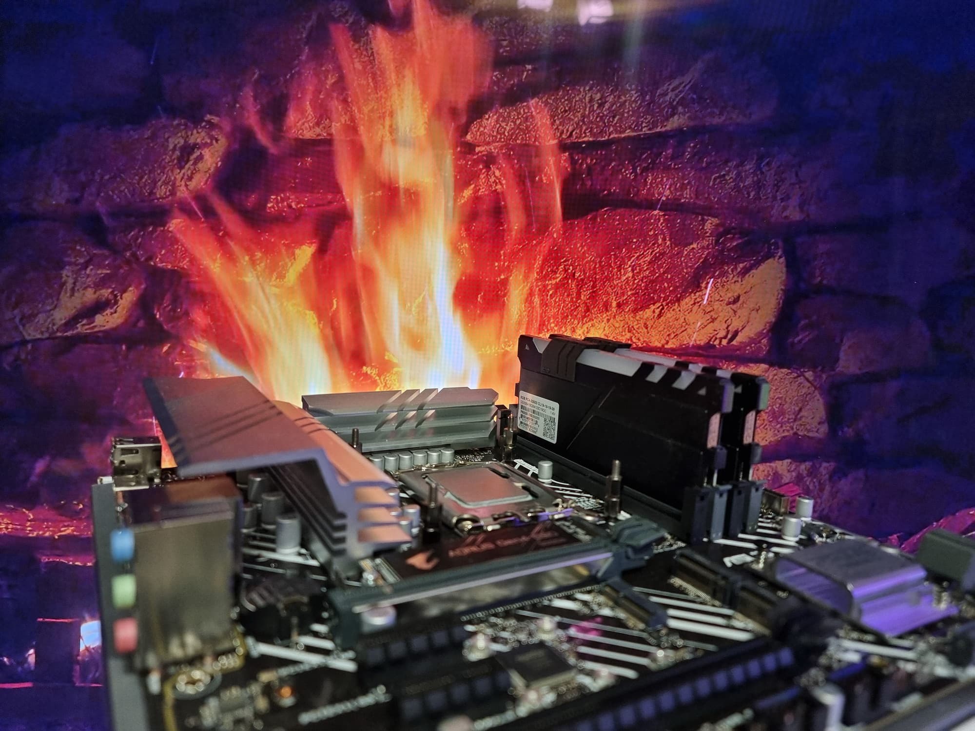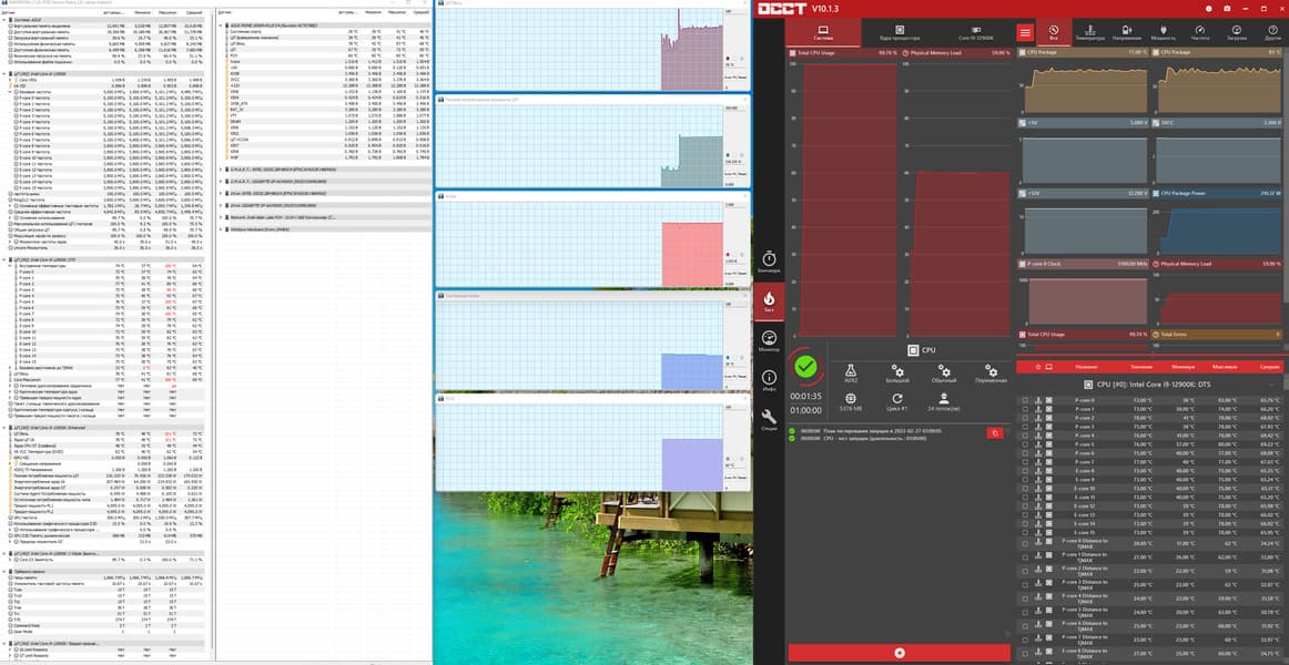 Но когда все получилось, и 5,1 ГГц реально заработал, я увидел, что даже у такой скромной материнки имеется великолепная поддержка супероверклокинга. Процессор в стресс-тесте работал на 5,1/3,9 ГГц, потребляя более 230 Вт, фирменная СВО прекрасно справлялась с нагревом, критических отметок не было, VRM, чипсет также не нагревались до критических величин. Только первые секунды был сильный нагрев из-за того, что СВО не сразу разогнала вентиляторы (поэтому максимумы по температуре процессора вышли к 100 градусам).