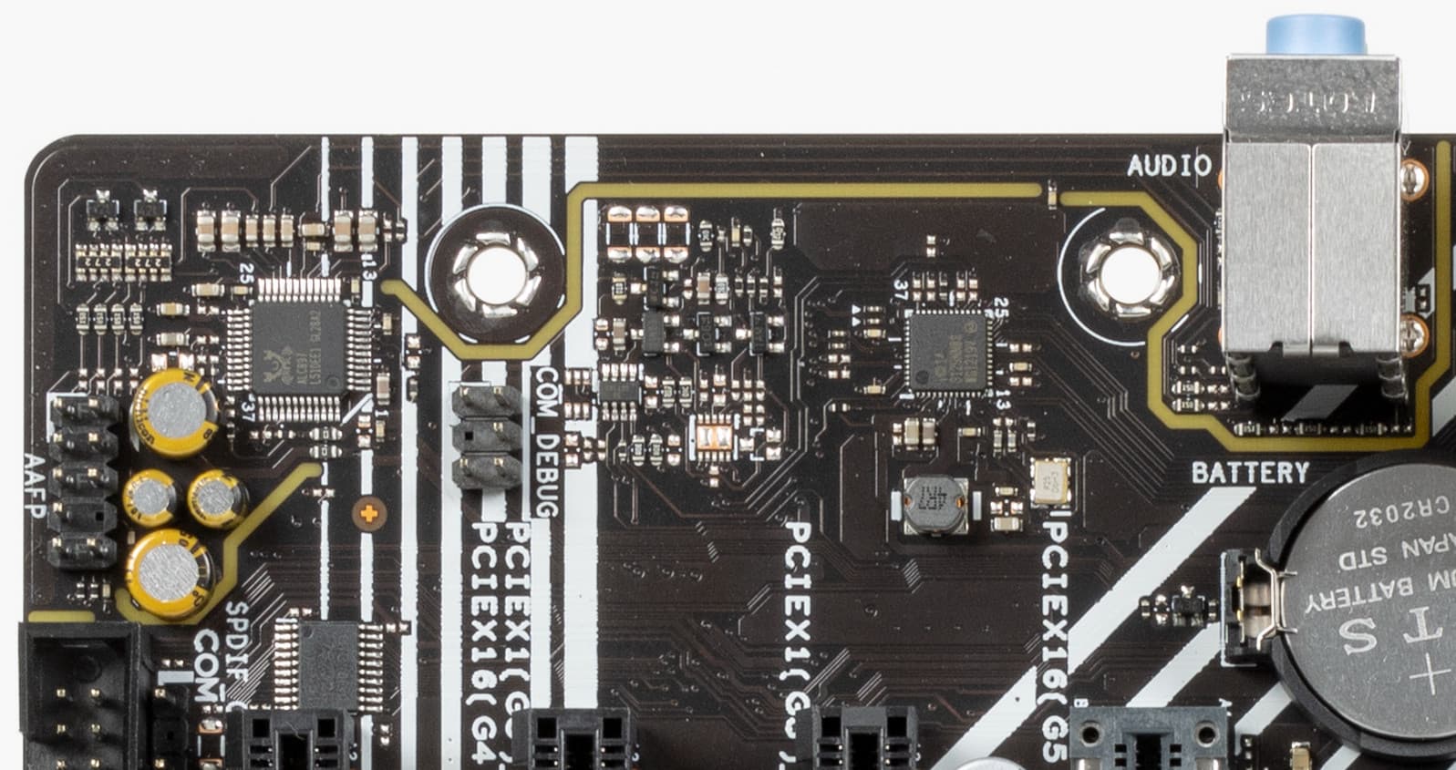 Аудиотракт вынесен на угловую часть платы, не пересекается с другими элементами. Все аудиоразъемы на задней панели имеют привычную цветовую окраску. S/PDIF вынесен в качестве внутреннего разъема на матплате (на задней панели его нет).