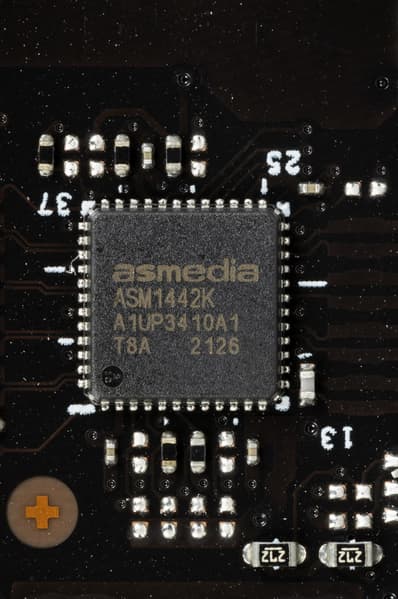 - 6 портов USB 2.0/1.1: 4 реализованы через Genesys Logic GL850G и представлены двумя внутренними разъемами (каждый на 2 порта, при этом одновременно может работать только одна из пар); 2 реализованы через Z690 и представлены портами Type-A на задней панели (черного цвета);.