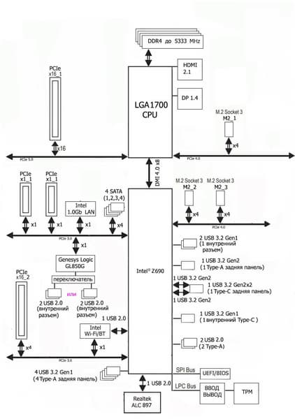 Процессоры Intel Core 12-го поколения (совместимые с сокетом LGA1700 и поддерживаемые Z690) имеют 20 линий ввода-вывода (16 PCIe 5.0, 4 PCIe 4.0), не имеют USB и SATA портов. При этом взаимодействие с Z690 идет по особому каналу Digital Media Interface 4.0 (DMI 4.0 x8). Все PCIe линии процессора идут на слоты расширения PCIe и порт М.2. Serial Peripheral Interface (SPI) используется для взаимодействия с системой UEFI/BIOS, а шина Low Pin Count (LPC) — для связи с устройствами ввода/вывода, не требующими высокой пропускной способности (контроллерами вентиляторов, TPM, старой периферии).