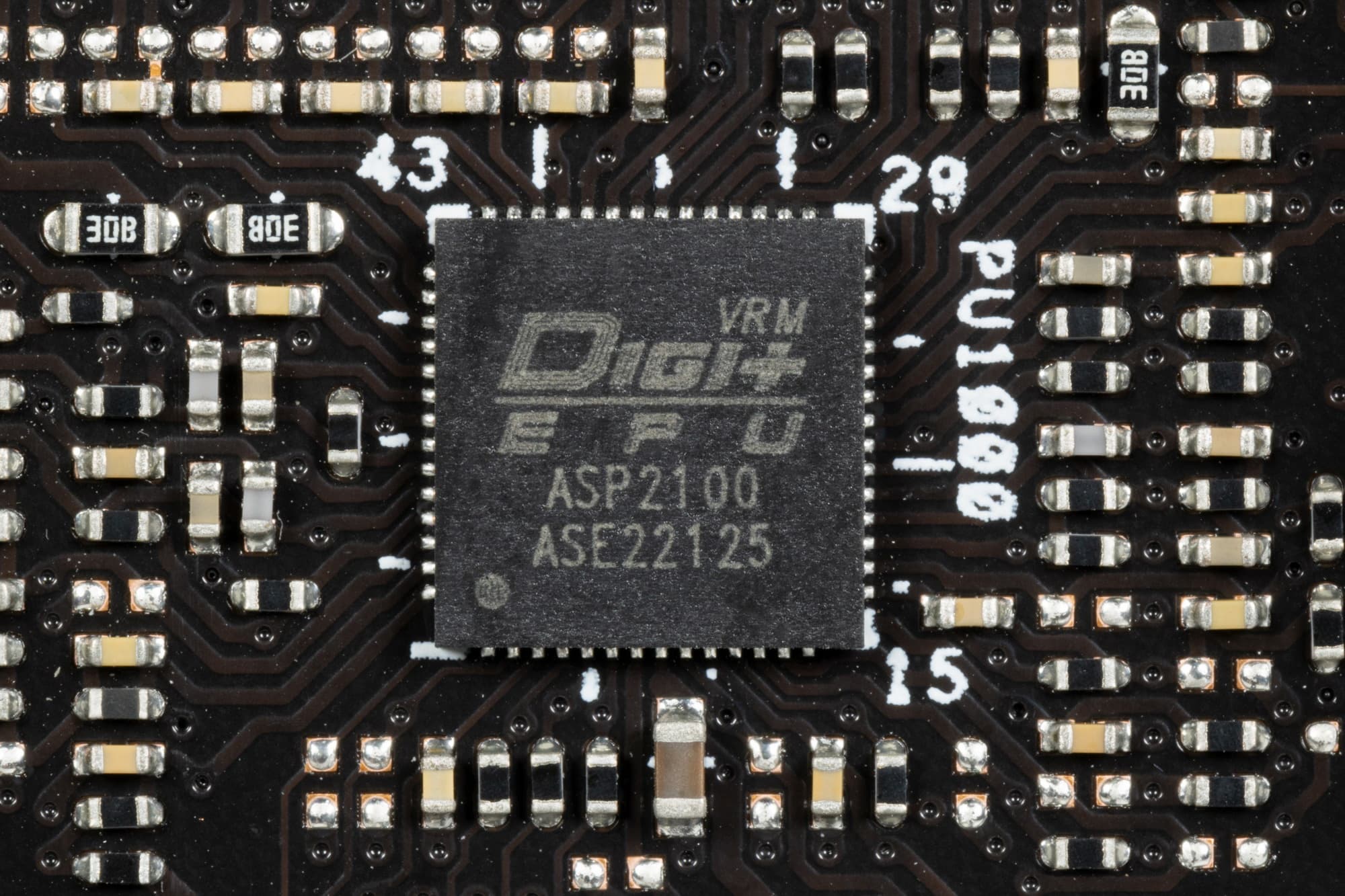 Управляет схемой VCore+iGPU фирменный ШИМ-контроллер DiGi+ ASP2100, рассчитанный максимум на 12 — 16 фаз (по разным сведениям).