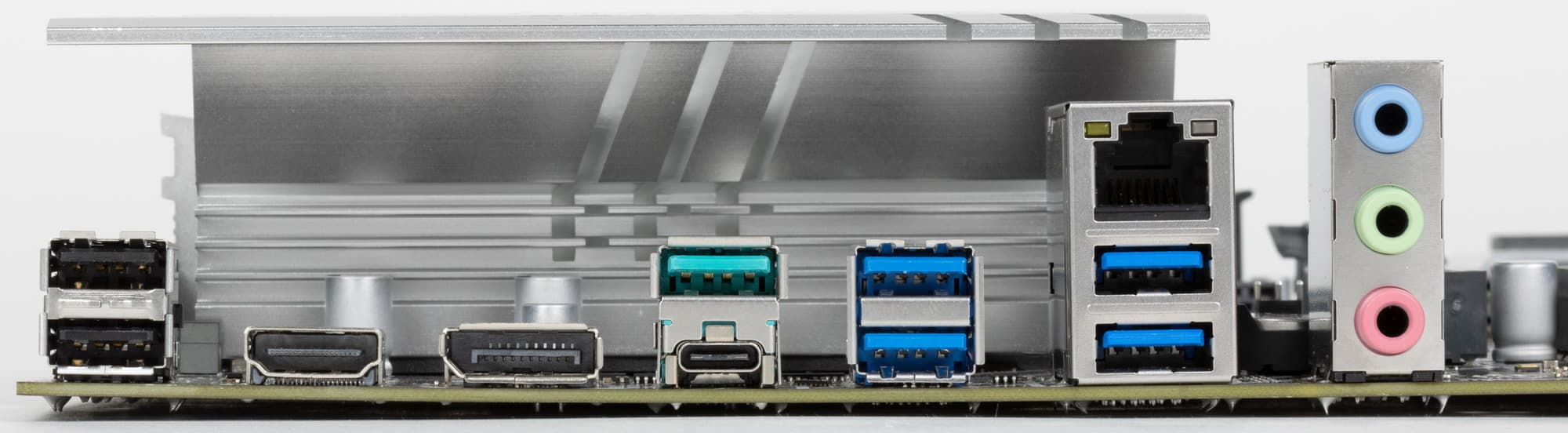 - 1 порт USB 3.2 Gen2x2: реализован с помощью Z690 (потрачены 2 линии USB 3.2 Gen2) и представлен на задней панели портом Type-C;