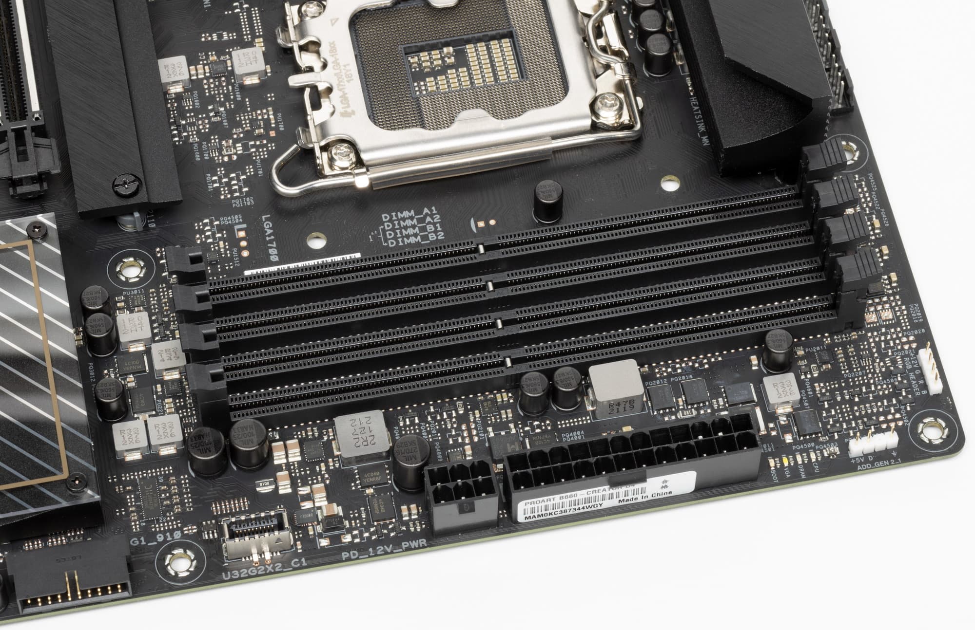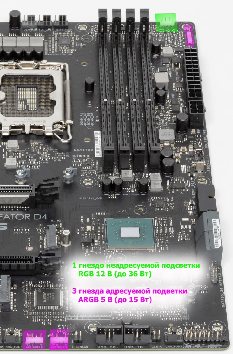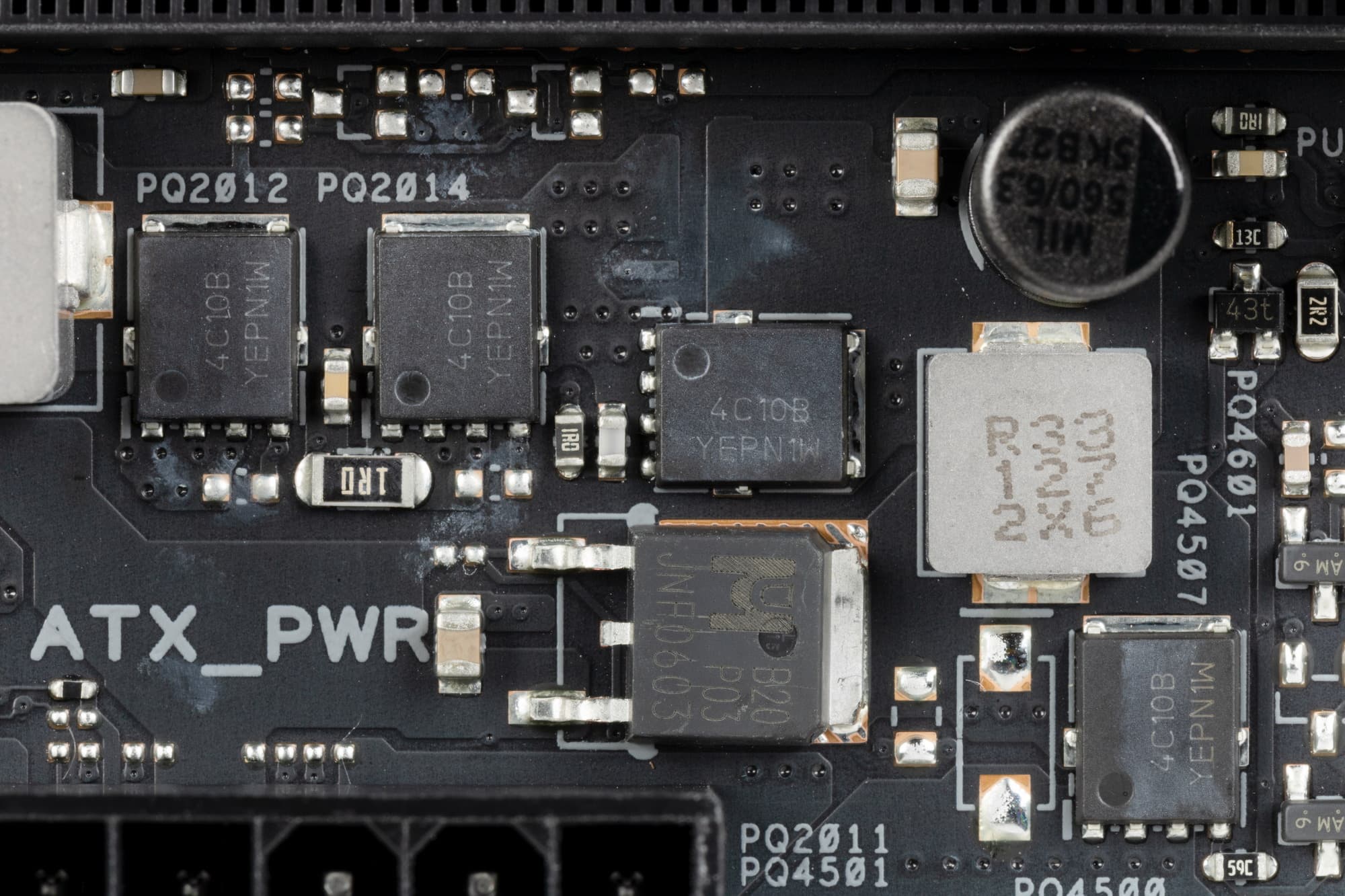 Для питания платы на ней предусмотрены 4 разъема: в дополнение к 24-контактному ATX здесь есть еще 8-контактный и 4-контактный EPS12V, а также 6-контактный PCIe разъем для усиления питания внутреннего Type-C порта USB 3.2 Gen2x2 для быстрой зарядки мобильных устройств.