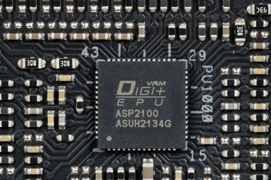 Управляет схемой питания VCore и iGPU фирменный ШИМ-контроллер Digi+ ASP2100.