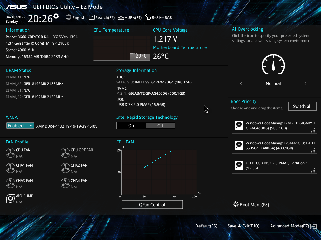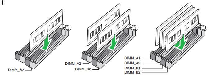 Для установки модулей памяти на плате Asus имеется 4 DIMM-слота (для работы памяти в Dual Channel в случае использования всего 2 модулей их следует устанавливать в А2 и B2). Плата поддерживает небуферизованную память DDR4 (non-EСС), а максимальный объем памяти составляет 128 ГБ. Поддерживаются профили XMP.