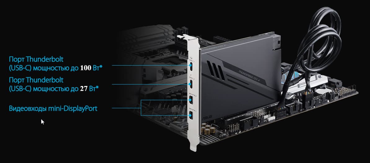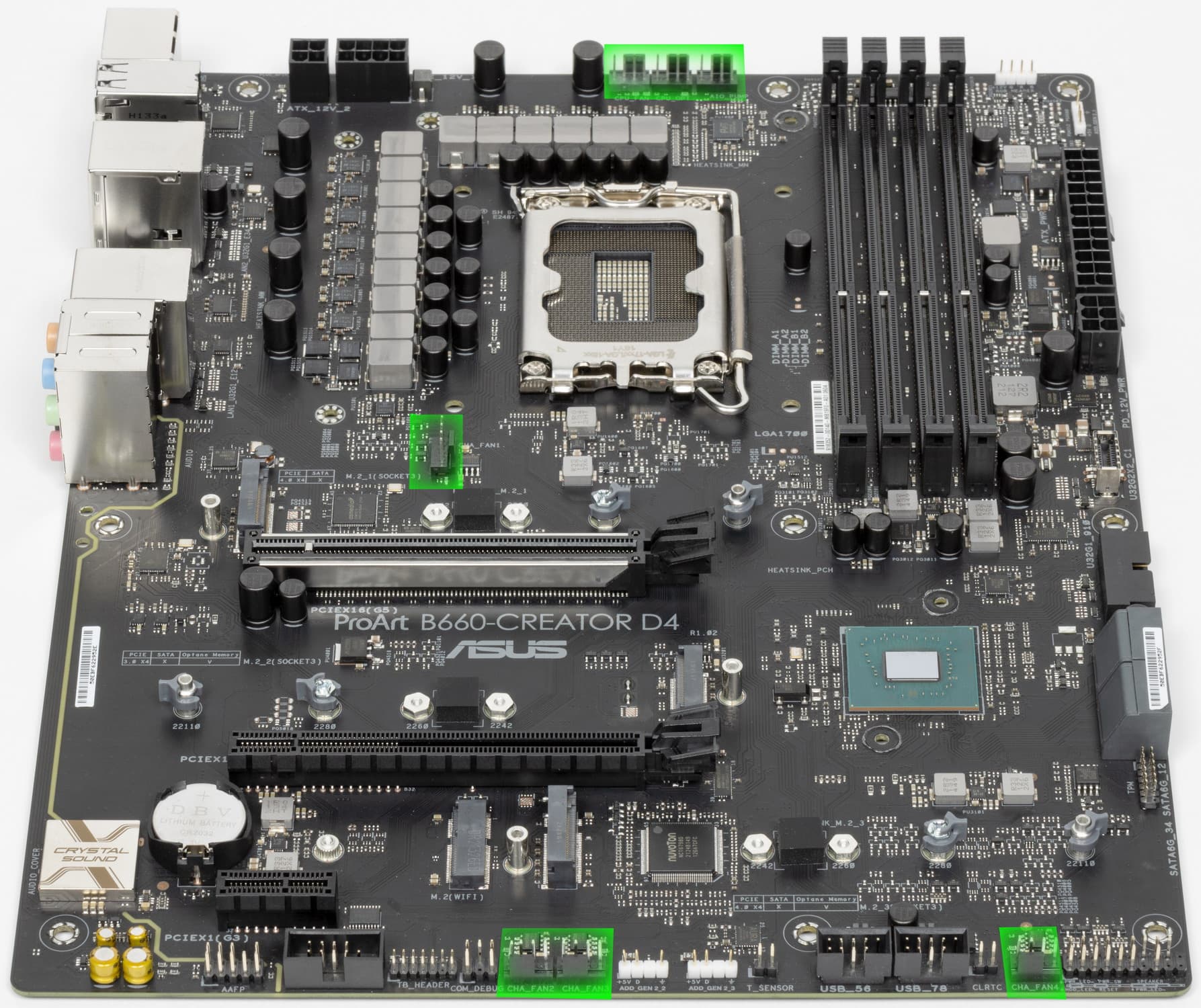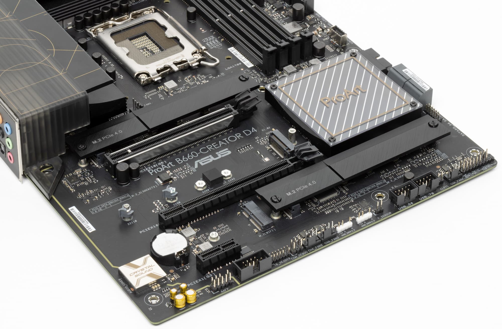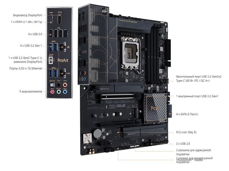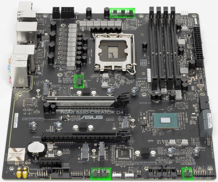 Asus ProArt B660-Creator D4 не относится к игровому или оверклокерскому семейству, но система питания процессора у нее весьма мощная, способная обеспечить работу любых совместимых процессоров с приличным запасом на разгон. Плата имеет эффективную систему охлаждения каждого потенциально греющегося элемента, включая накопители в двух слотах M.2. Стоит отметить и потенциальную поддержку Thunderbolt 4: для этого потребуется приобрести отдельный дискретный контроллер, но это позволит передавать данные на скорости 40 Гбит/с и выводить картинку на приемник с интерфейсом Thunderbolt 4.
