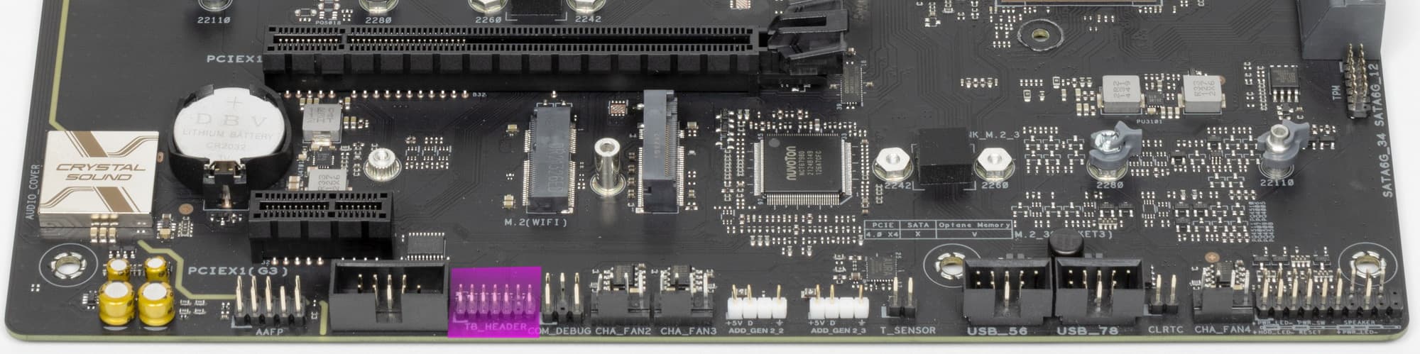 - 1 порт USB 3.2 Gen2x2: реализован с помощью двух линий USB 3.2 Gen2 (одна от B660 и вторая от ITE IT8856) и представлен внутренним портом Type-C (для подключения к соответствующему разъему на передней панели корпуса);