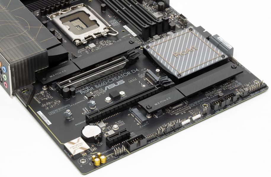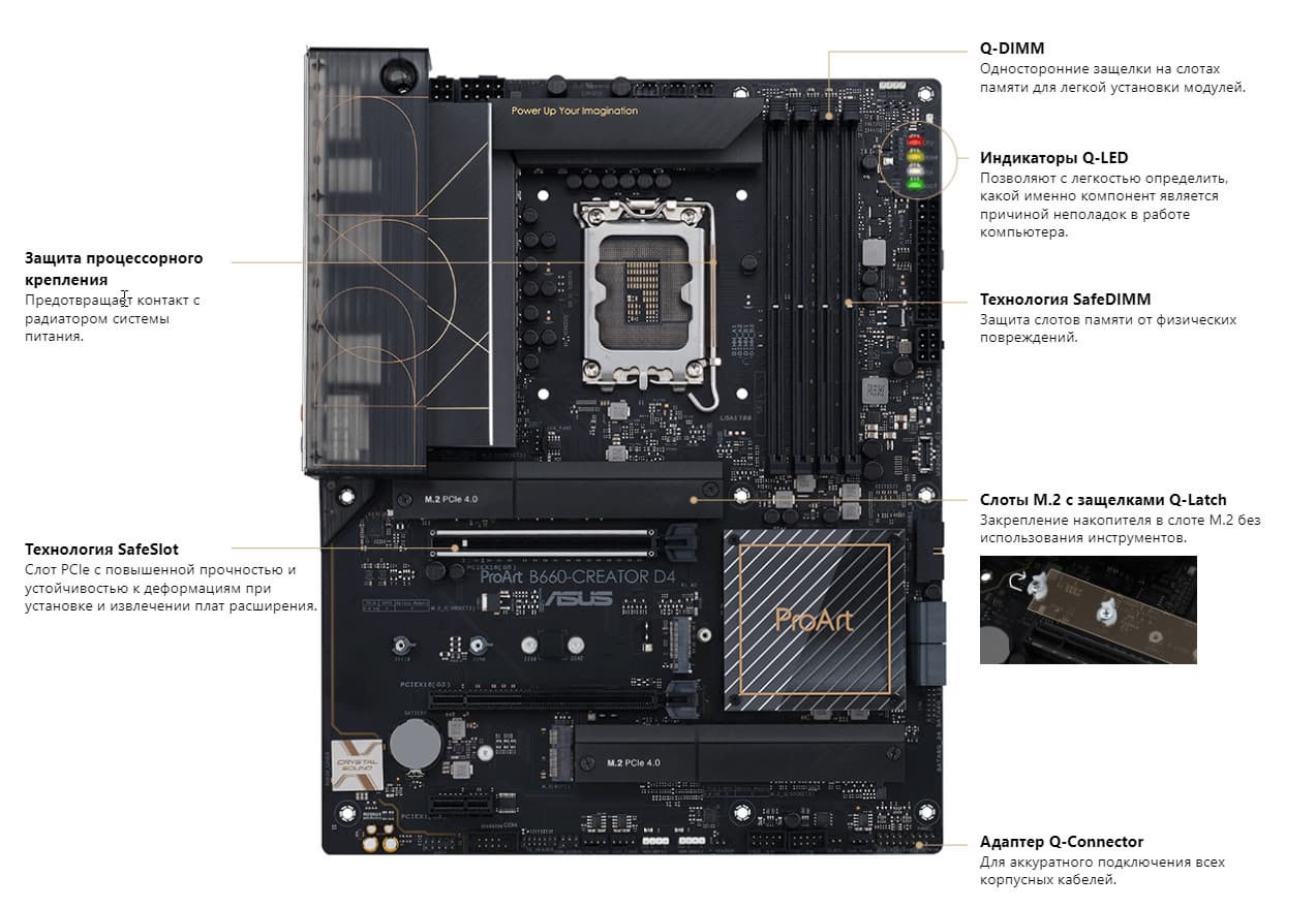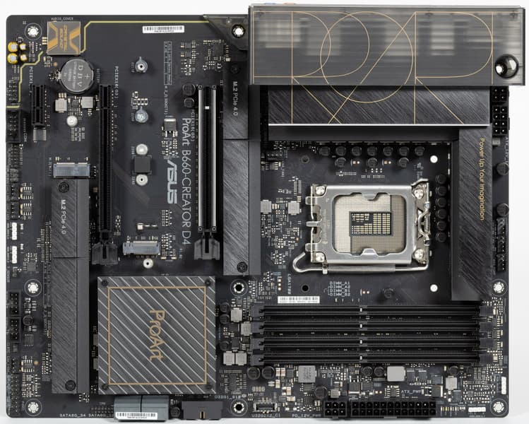 Герой нынешнего обзора — Asus ProArt B660-Creator D4. Сразу отмечу, что у компании Asus суффикс D4 в названиях означает поддержку памяти DDR4, что опять-таки очень важно для материнок среднего ценового сегмента из-за пока еще сильной дороговизны DDR5.