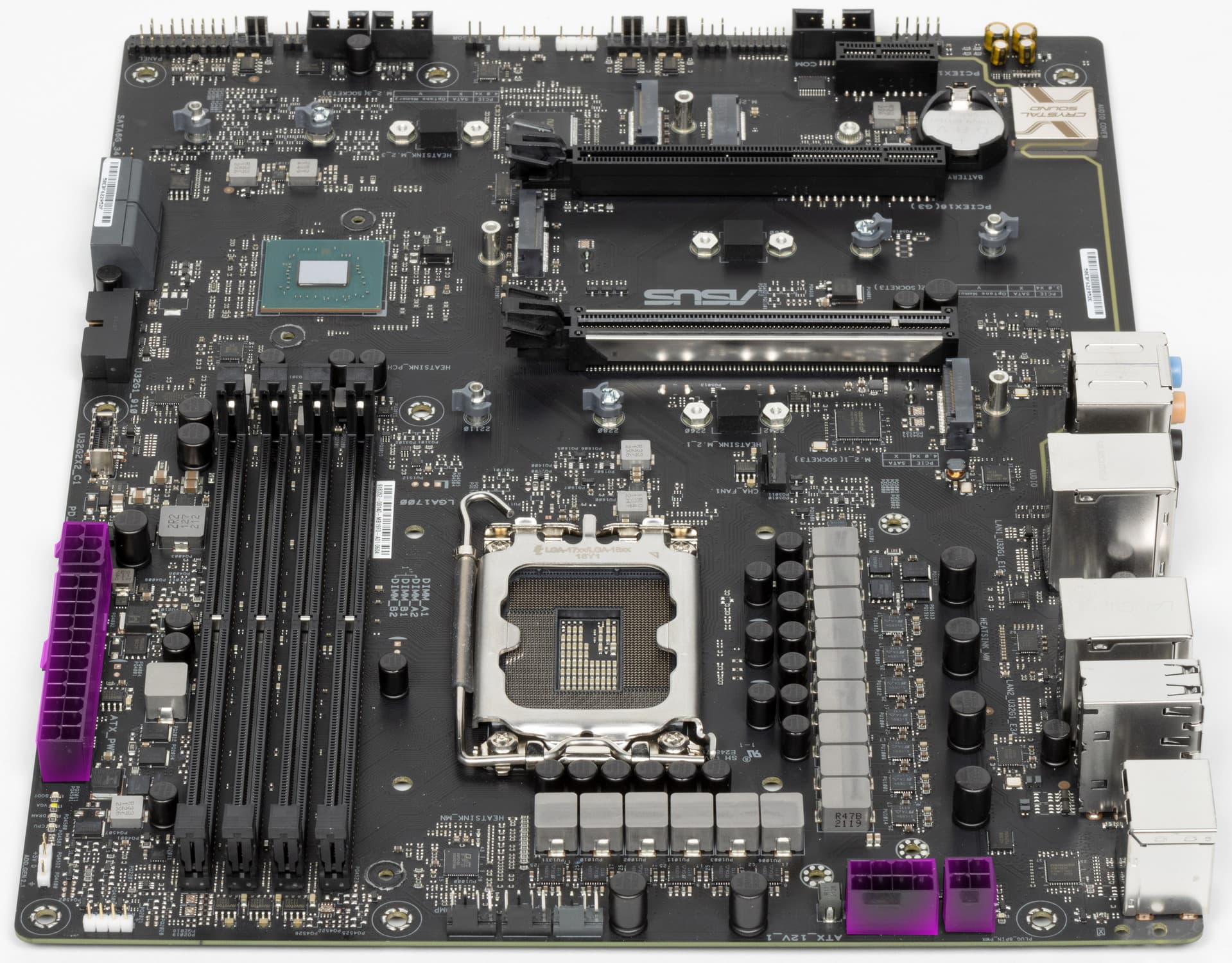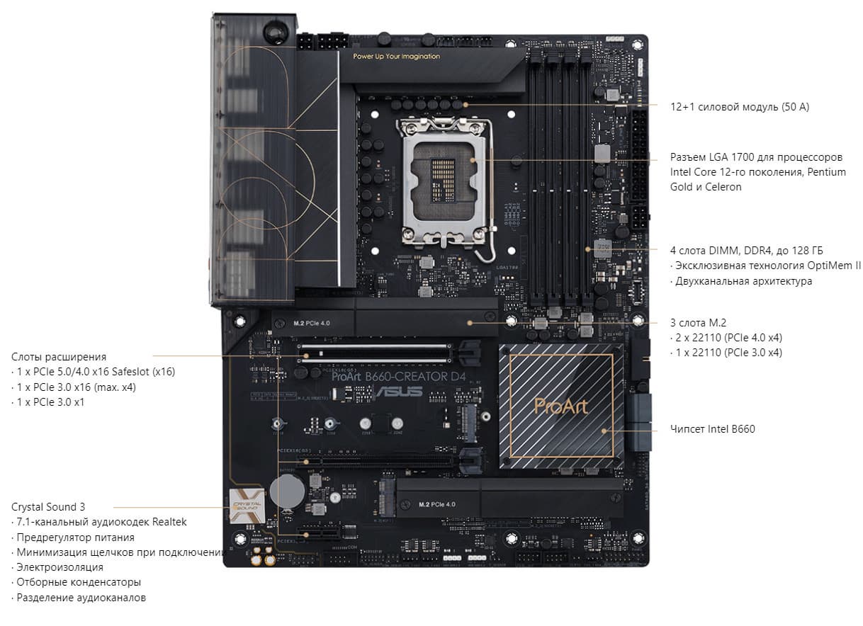 Asus ProArt B660-Creator D4 поддерживает процессоры Intel Core 12-го поколения, выполненные под разъем (сокет) LGA1700. Официально система крепления систем охлаждения для CPU несовместима с той, что для LGA1151/1200, однако все же ряд старых СО все же сможет быть применим, лишь придется где-то приобретать или заказывать у производителя комплект крепежа под LGA 1700. Дело в в том, что кулеры с жесткой установкой в матплате на фиксированную высоту могут не достать до 12ххх. Подойдут лишь СО с пружинистой посадкой подошвы на процессор.