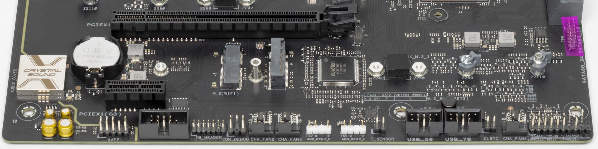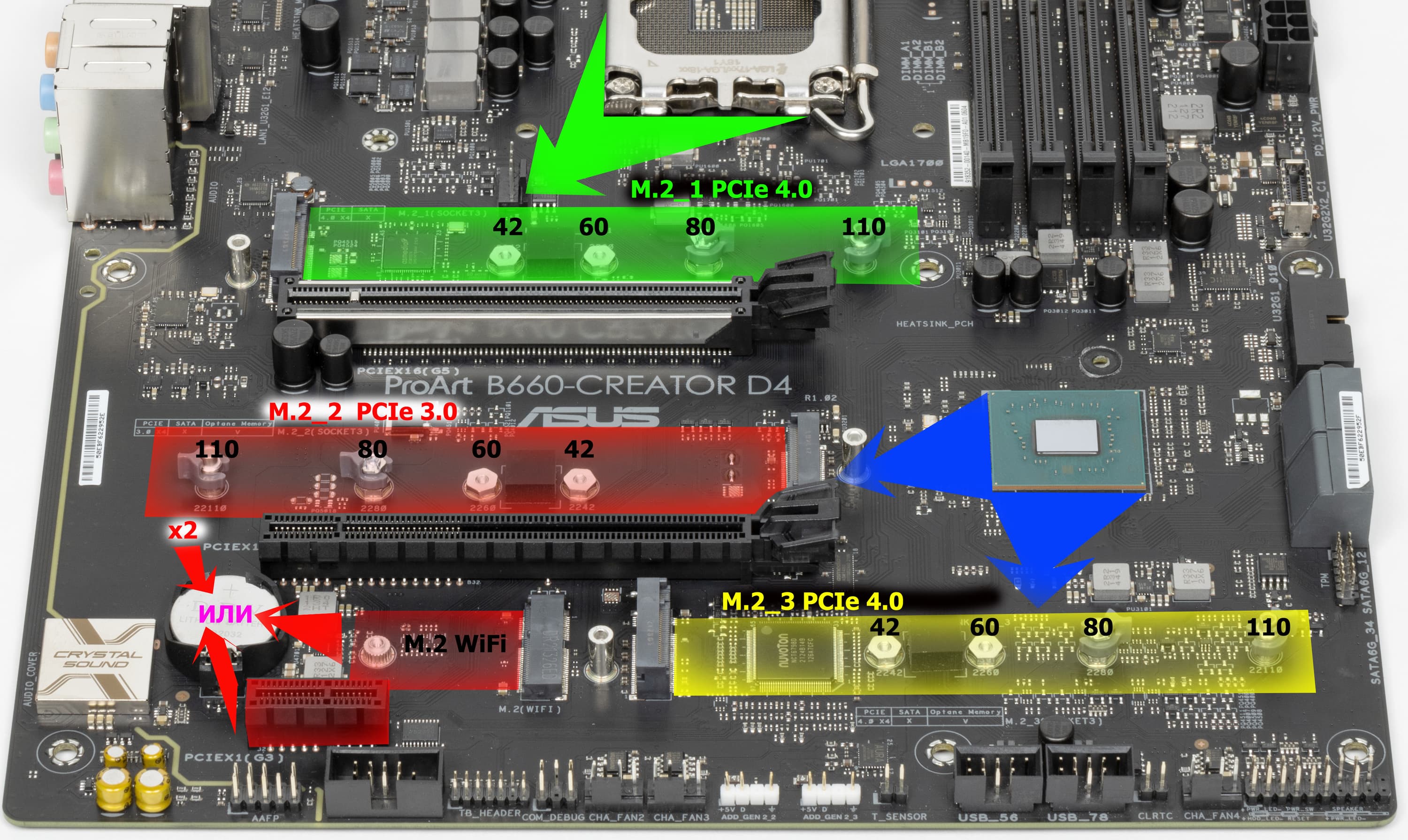 Второй M.2_2 и третий M.2_3 получают данные от чипсета B660. При этом M.2_3 работает в режиме PCIe 4.0 x4, а вот М.2_2 (PCIe 3.0) делит ресурсы с M.2 (Key E, WiFi) и слотом PCIe x1_1: если хотя бы один из перечисленных слотов занят, то М.2_2 переходит в режим х2, иначе – х4 (PCIe 3.0).