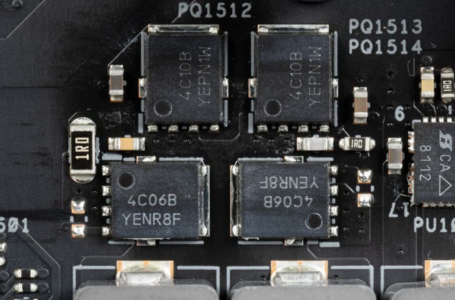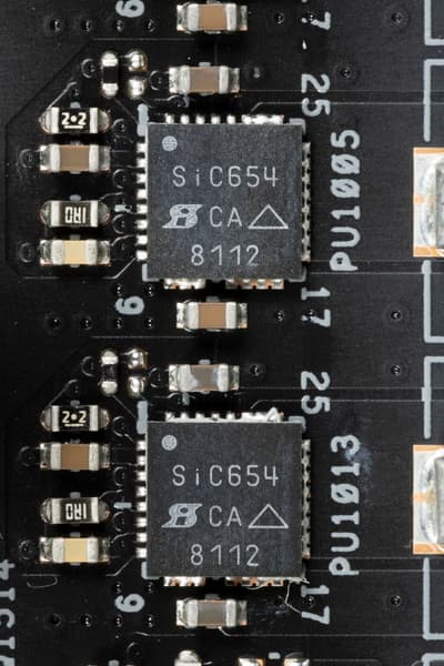 Каждый канал фазы имеет суперферритовый дроссель и SiC654 мосфеты от Vishay на 50А для VCore и встроенного графического ядра.