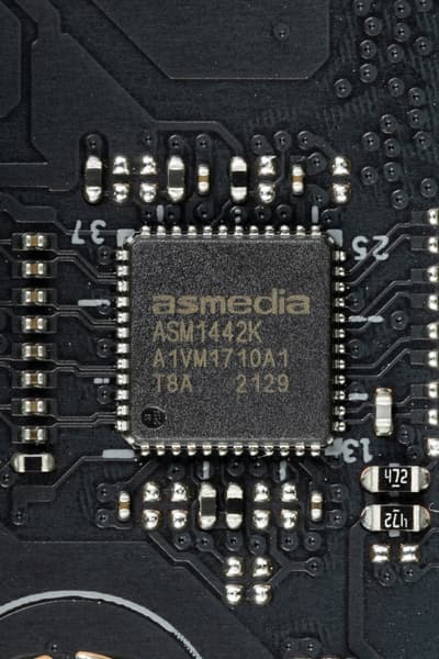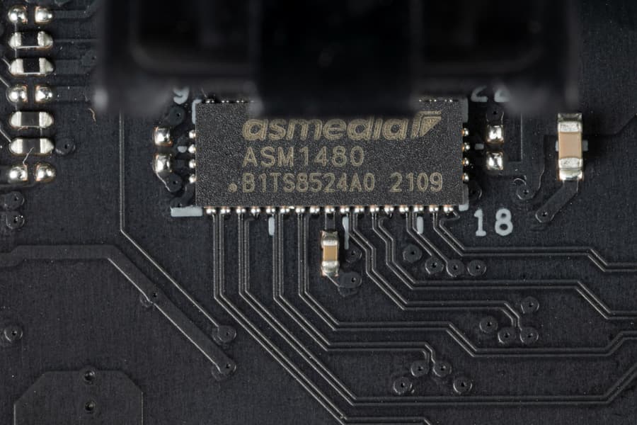 - 6 портов USB 3.2 Gen1: 4 реализованы через хаб ASMedia ASM1074 (на него потрачена линия USB 2.0 от B660) и представлены на задней панели 4 портами Type-A (синего цвета); остальные 2 реализованы через B660 и представлены внутренним разъемом на материнской плате на 2 порта;