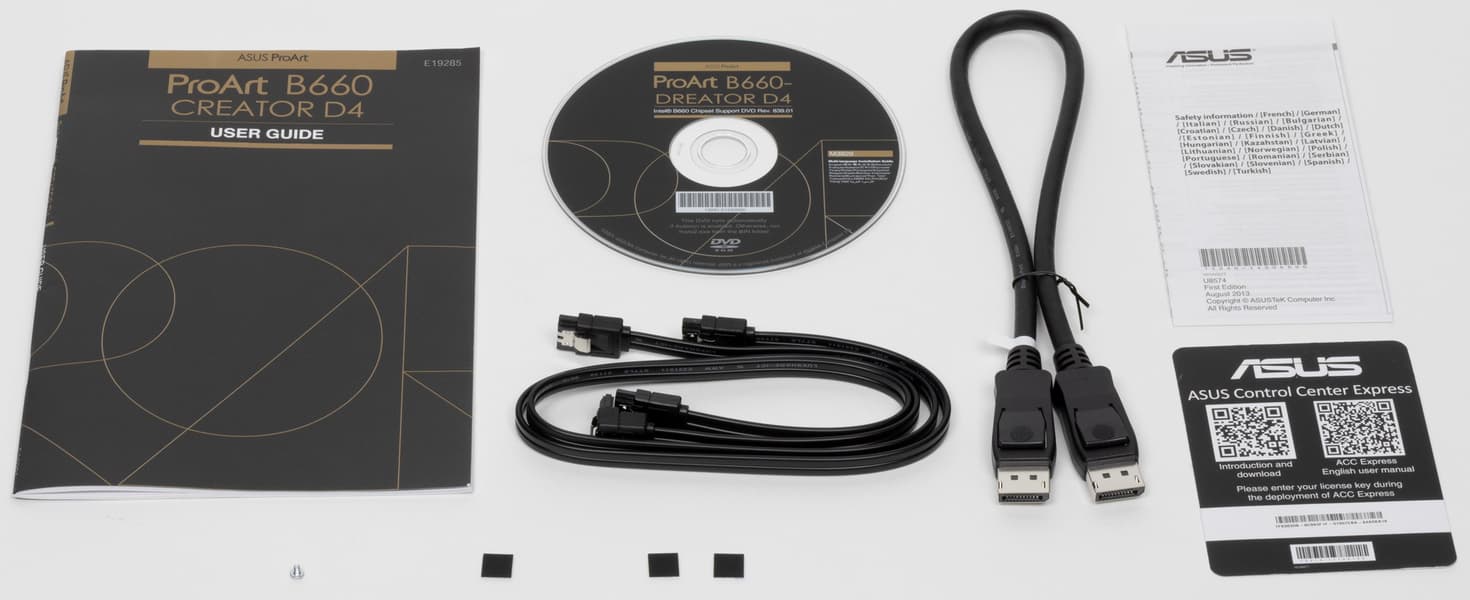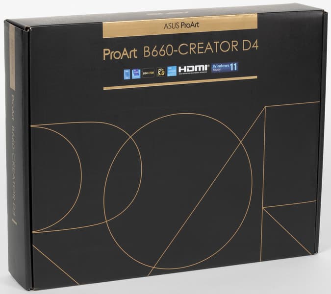 Asus ProArt B660-Creator D4 поставляется в стандартной коробке фирменного дизайна серии ProArt. Комплект размещен под платой в отдельном отсеке.