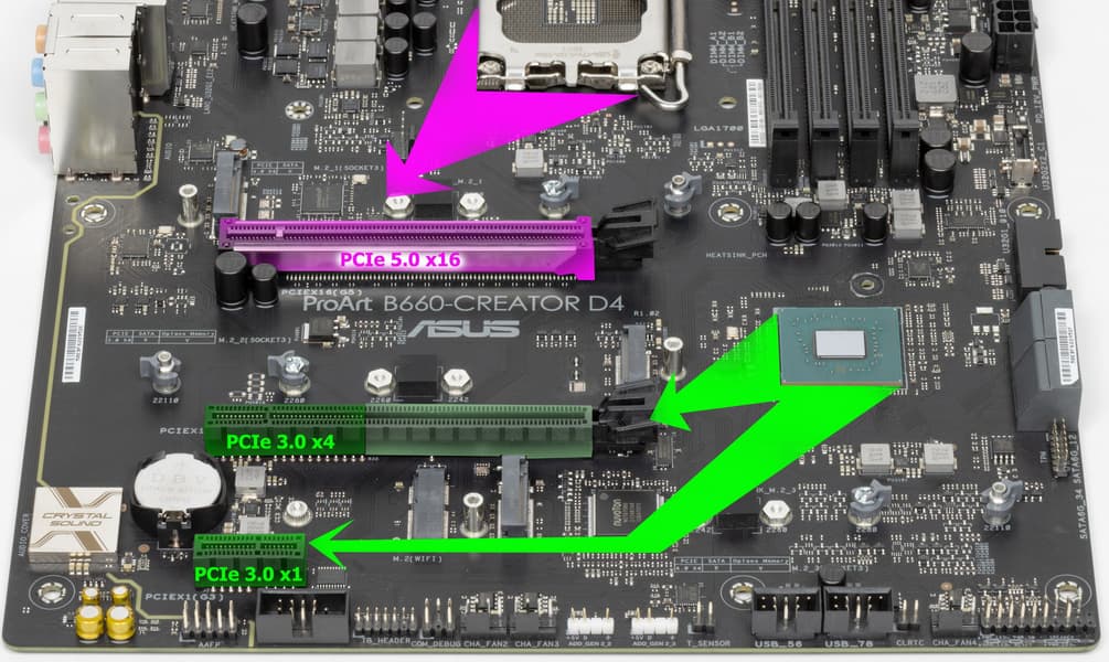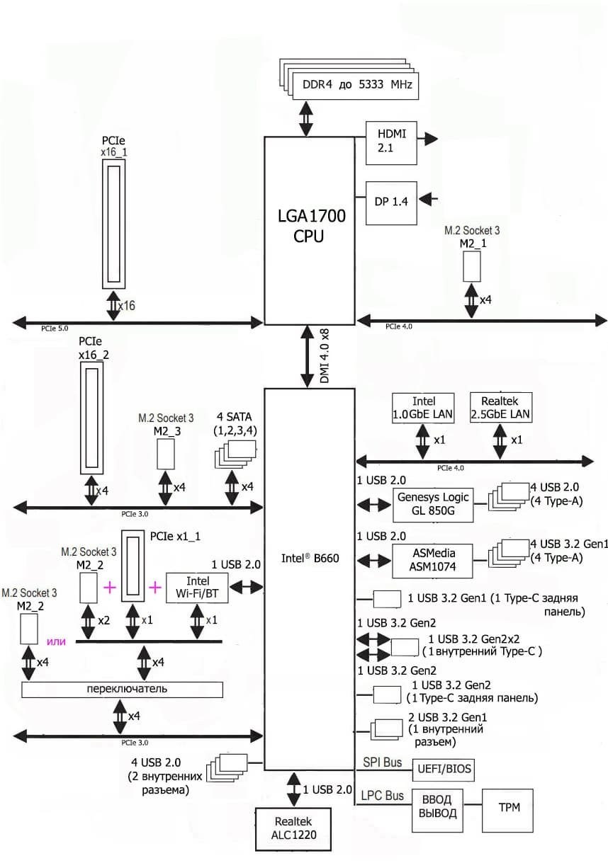 Процессоры Intel Core 12-го поколения (совместимые с сокетом LGA1700 и поддерживаемые B660/Z690) имеют 20 линий ввода-вывода (16 PCIe 5.0, 4 PCIe 4.0), не имеют USB и SATA портов. При этом взаимодействие с B660 идет по особому каналу Digital Media Interface 4.0 (DMI 4.0 x4 (именно х4!)). Все PCIe линии процессора идут на слоты расширения PCIe и порт М.2. Serial Peripheral Interface (SPI) используется для взаимодействия с системой UEFI/BIOS, а шина Low Pin Count (LPC) — для связи с устройствами ввода/вывода, не требующими высокой пропускной способности (контроллерами вентиляторов, TPM, старой периферии).