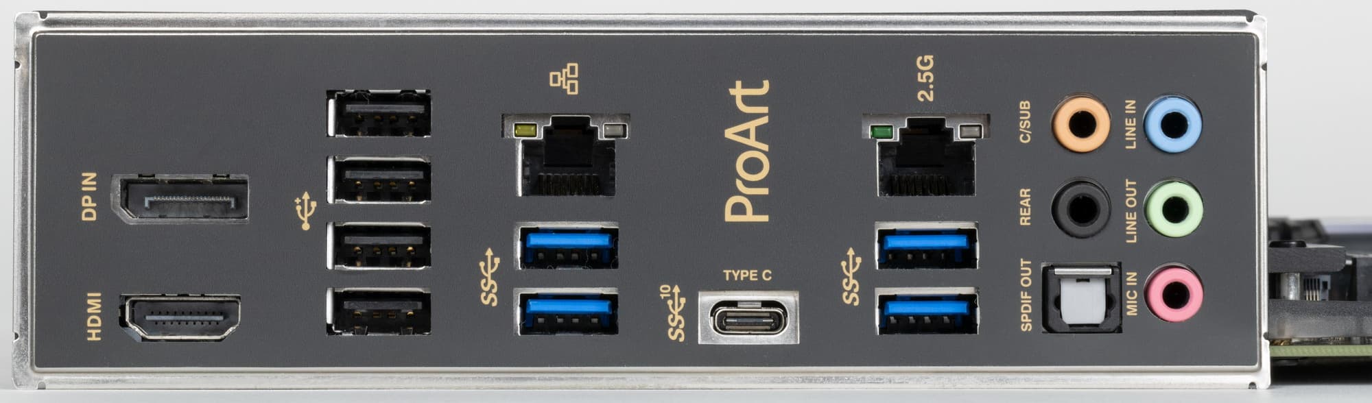 | Разъемы на задней панели | 1 × USB 3.2 Gen2 (Type-C) 4 × USB 3.2 Gen1 (Type-A) 4 × USB 2.0 (Type-A) 2 × RJ-45 5 аудиоразъемов типа миниджек 1 разъем S/PDIF 1 разъем HDMI out 1 разъем Display Port in |